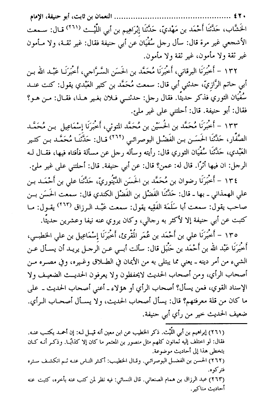 133- أَخْبَرَنَا مُحَمَّدُ بْنُ الْحُسَيْنِ بْنِ مُحَمَّدٍ الْمَتُّوثِيُّ، أخبرنا إسماعيل بن محمّد الصّفّار، حَدَّثَنَا الحَسَن بن الفضل البوصرائي [2] قَالَ: حَدَّثَنَا محمّد بن كثير العبدي، حَدَّثَنَا سُفْيَان الثوري قَالَ: رأيته وسأله رجل عن مسألة فأفتاه فيها، فَقَالَ لَهُ الرجل: إِنَّ فيها أثرًا. قَالَ لَهُ: عمن؟ قَالَ: عن أَبِي حنيفة. قَالَ: أحلتني عَلَى غير ملئ.