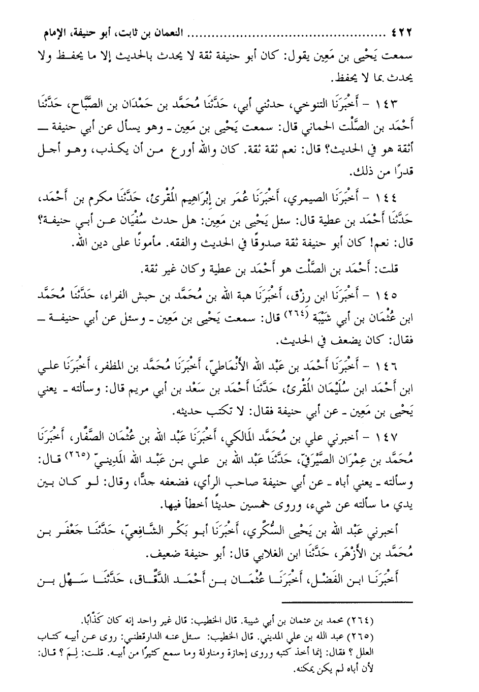 143- أَخْبَرَنَا التنوخي، حدثني أبي، حدّثنا محمّد بن حمدان بن الصّبّاح، حدثنا أحمد بن الصلت الحماني قال: سمعت يَحْيَى بن معين- وَهُوَ يُسْأَلُ عن أَبِي حنيفة- أثقة هُوَ في الحديث؟ قَالَ: نعم ثقة ثقة. كَانَ والله أورع من أن يكذب، وَهُوَ أجل قدرا من ذَلِكَ.
