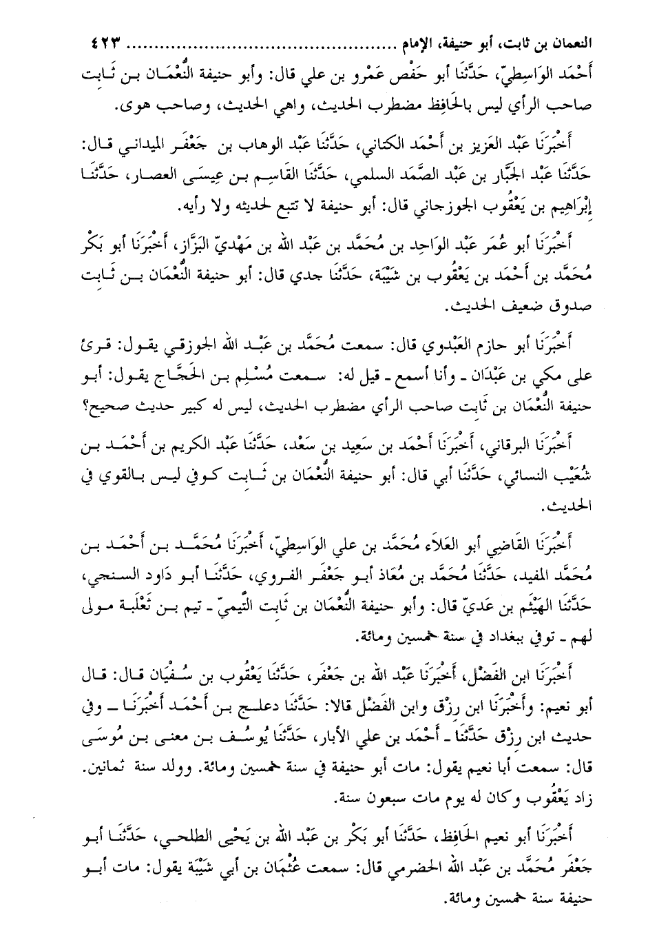 أَخْبَرَنَا القاضي أبو العلاء محمد بن علي الواسطي، أَخْبَرَنَا محمد بن أحمد بن محمد المفيد، حدّثنا محمّد بن معاذ أبو جعفر الفروي، حدّثنا أبو داود السنجي، حَدَّثَنَا الهَيْثَم بن عَدِيّ قَالَ: وَأَبُو حنيفة النُّعْمَان بن ثابت التَّيْمِيّ- تيم بن ثعلبة مولى لهم- توفي ببغداد في سنة خمسين ومائة.