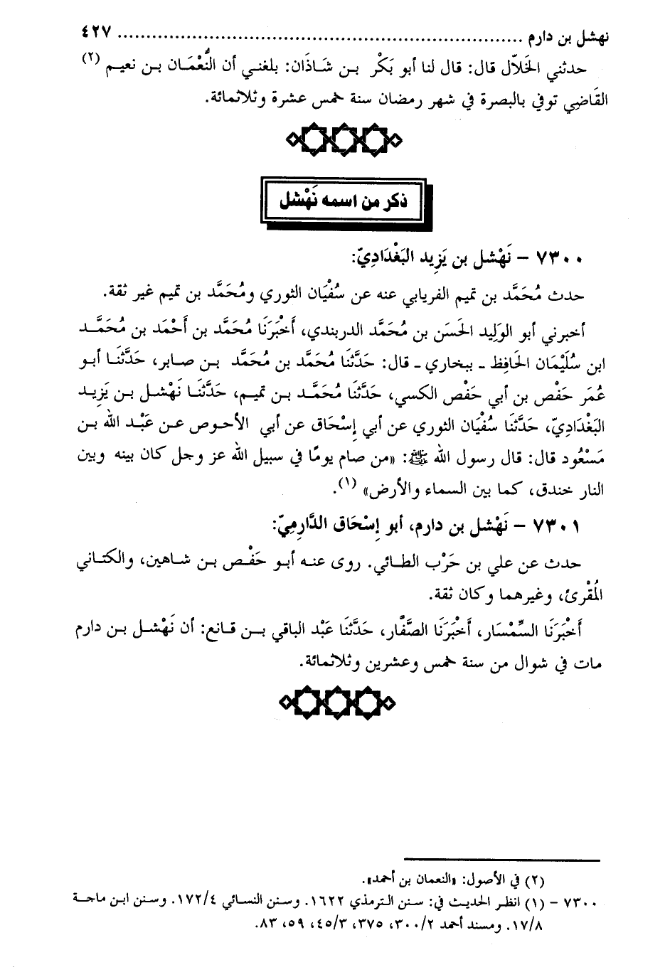 أَخْبَرَنَا السّمسار، أخبرنا الصّفّار، حَدَّثَنَا عبد الباقي بن قانع: أن نهشل بن دارم مات فِي شوَال من سنة خمس وعشرين وثلاثمائة.