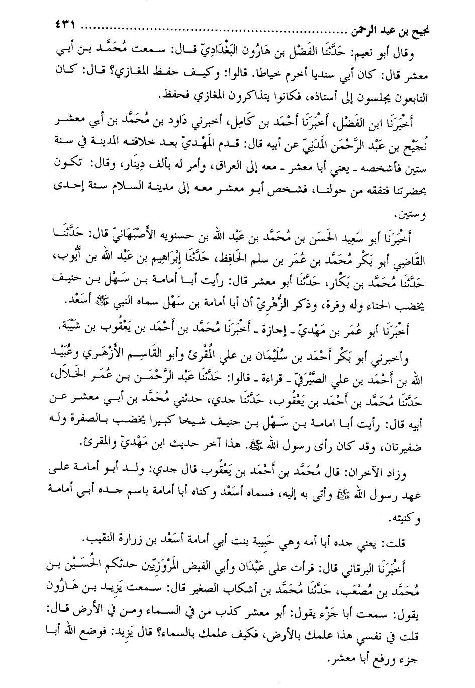 وأَخْبَرَنِي أَبُو بَكْر أَحْمَد بْن سُلَيْمَانَ بْن عَلِيٍّ الْمُقْرِئُ وَأَبُو الْقَاسِمِ الأَزْهَرِيُّ وَعُبَيْدِ اللَّه بْن أَحْمَد بْن عَلِيٍّ الصَّيْرَفِيُّ- قِرَاءَةً- قَالُوا: حَدَّثَنَا عَبْد الرَّحْمَن بْن عُمَر الْخَلالُ، حَدَّثَنَا مُحَمَّد بن أحمد بن يعقوب، حدّثنا جدي، حَدَّثَنِي مُحَمَّدُ بْنُ أَبِي مَعْشَرٍ عَنْ أَبِيهِ قَالَ: رَأَيْتُ أَبَا أُمَامَةَ بْنَ سَهْلِ بْنِ حُنَيْفٍ شَيْخًا كَبِيرًا يَخْضِبُ بِالصُّفْرَةِ وَلَهُ ضَفِيرَتَانِ، وَقَدْ كَانَ رَأَى رَسُولُ اللَّهِ صَلَّى اللَّهُ عَلَيْهِ وَسَلَّمَ. هَذَا آخِرُ حَدِيثِ ابْنِ مَهْدِيٍّ وَالْمُقْرِئُ.
