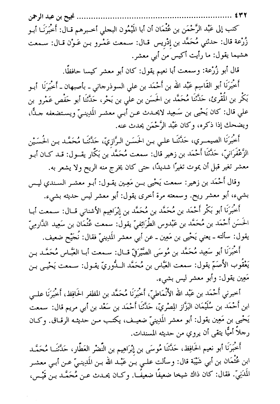 أَخْبَرَنَا أَبُو الْقَاسِم عَبْد اللَّهِ بْنُ أَحْمَدَ بْنِ علي السوذرجاني- بأصبهان- أخبرنا أبو بكر بن المقرئ، حدثنا محمد بن الحسن بن علي بن بحر، حدثنا أبو حفص عمرو بن علي قال: كَانَ يَحْيَى بن سَعِيد لا يحدث عن أَبِي معشر المَدينِي ويستضعفه جدا، ويضحك إِذَا ذكره، وَكَانَ عَبْد الرَّحْمَن يحدث عَنْهُ.