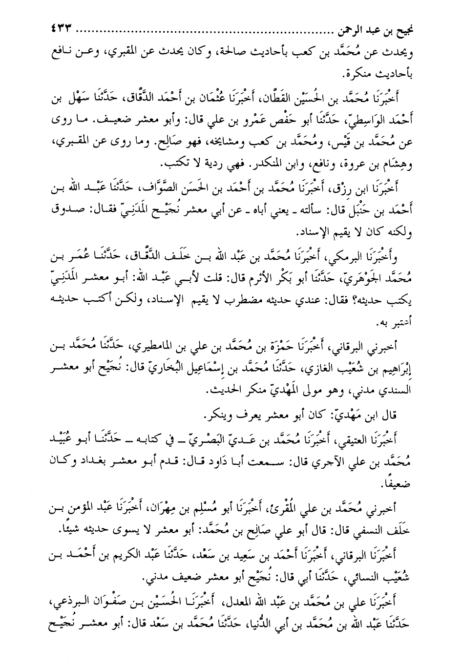 وأخبرنا البرمكي، أخبرنا مُحَمَّدُ بْنُ عَبْدِ اللَّهِ بْنِ خَلَفِ الدّقّاق، حدّثنا عمر بن محمّد الجوهريّ، حَدَّثَنَا أَبُو بكر الأثرم قَالَ: قلت لأبي عَبْد الله: أَبُو معشر الْمَدَنِيّ يكتب حديثه؟ فَقَالَ: عندي حديثه مضطرب لا يقيم الإسناد، ولكن أكتب حديثه أعتبر بِهِ.