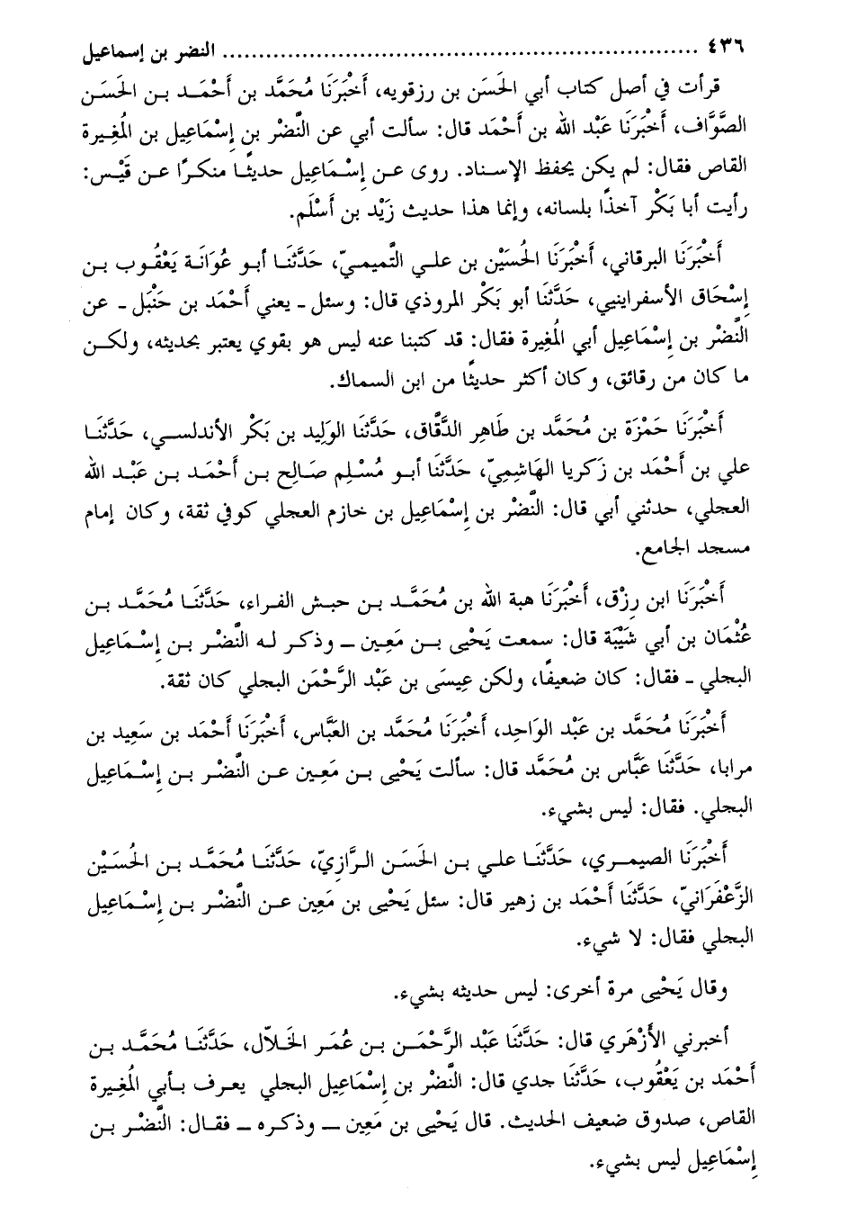 أَخْبَرَنِي الأَزْهَرِيّ قَالَ: حَدَّثَنَا عبد الرحمن بن عمر الخلّال، حدّثنا محمّد بن أحمد بن يعقوب، حَدَّثَنَا جدي قَالَ: النضر بن إِسْمَاعِيل البَجَلِيّ يعرف بأبي المغيرة القاص، صدوق ضعيف الحديث. قَالَ يَحْيَى بن معين- وذكره- فقال: النضر بن إسماعيل ليس بشيء.