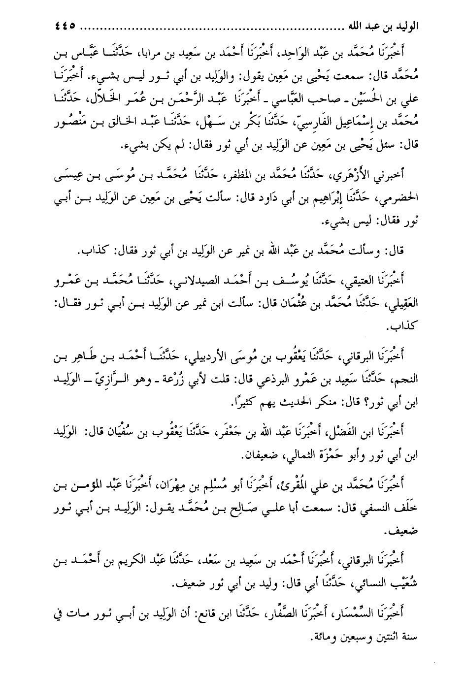 أَخْبَرَنَا العتيقي، حدّثنا يوسف بن أحمد الصيدلاني، حدّثنا محمّد بن عمرو العقيلي، حَدَّثَنَا مُحَمَّد بن عثمان قال: سألت ابن نمير عن الوليد بن أبي ثور فقال: