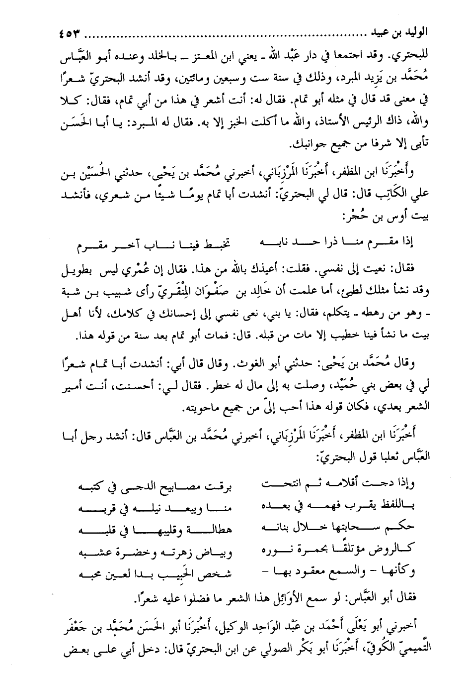 أَخْبَرَنَا ابن المظفر، أخبرنا المرزباني، أَخْبَرَنِي مُحَمَّد بن العَبَّاس قَالَ: أنشد رجل أَبَا العَبَّاس ثعلبا قول البُحْتُريّ: