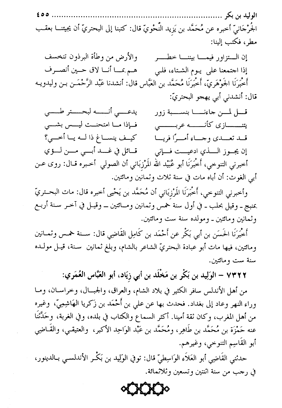 أَخْبَرَنَا الْحَسَن بْن أَبِي بَكْرٍ عَن أَحْمَد بْن كامل الْقَاضِي قَالَ: سَنَةَ خَمْسٍ وَثَمَانِينَ وَمِائَتَيْنِ، فِيهَا مَاتَ أَبُو عبادة البُحْتُريّ الشَّاعِر بالشام، وبلغ ثمانين سنة، قيل مولده سنة ستٍّ ومائتين.
