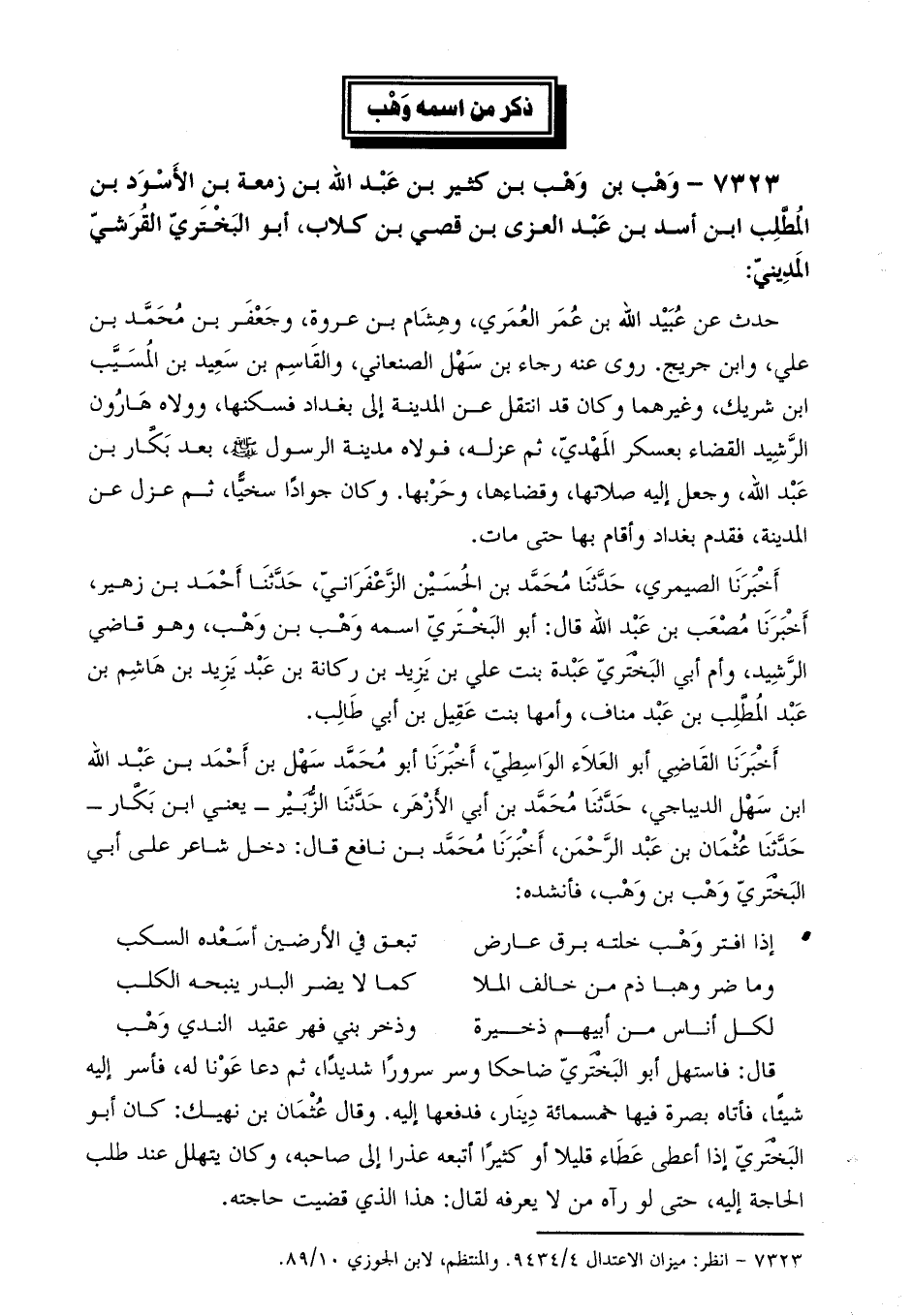 7323- وهب بن وهب بن كثير بن عبد الله بن زمعة بن الأسود بن المطّلب ابن أسد بن عبد العزى بن قصي بن كلاب، أَبُو البختري القرشي المديني [1] :