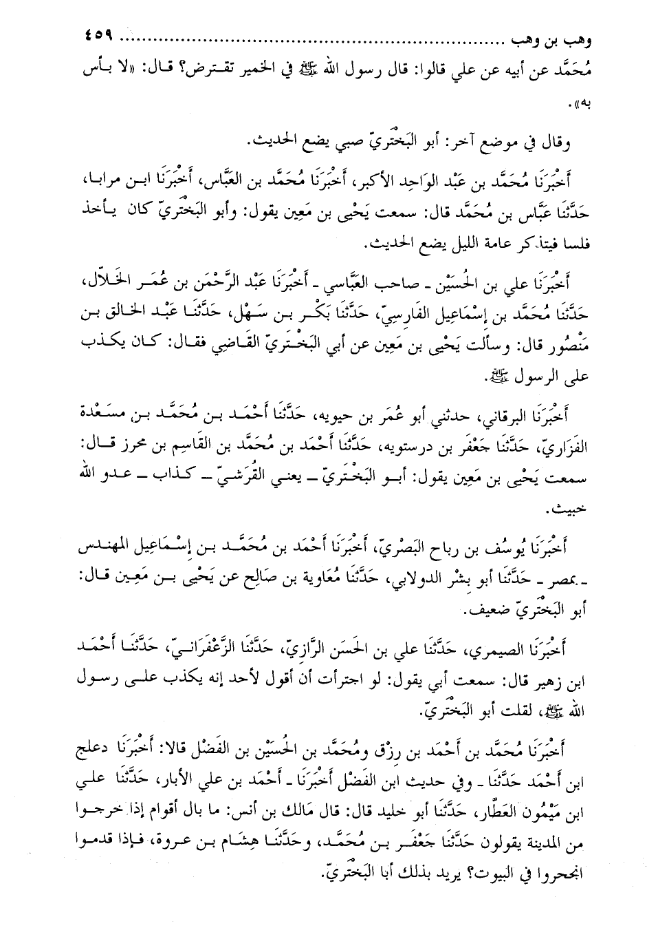 أَخْبَرَنَا الصيمري، حدّثنا علي بن الحسن الرّازيّ، حدّثنا الزّعفرانيّ، حدّثنا أحمد ابن زهير قَالَ: سَمِعْتُ أَبِي يَقُولُ: لو اجترأت أن أقول لأحد إنه يكذب عَلَى رَسُولِ اللَّهِ صَلَّى اللَّهُ عَلَيْهِ وَسَلَّمَ، لقلت أَبُو البَخْتَرِيّ.