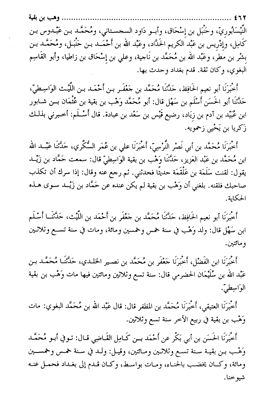 أَخْبَرَنَا أَبُو نُعَيْمٍ الْحَافِظُ، حَدَّثَنَا مُحَمَّد بْن جعفر بْن أَحْمَد بْن اللّيث الواسطيّ، حَدَّثَنَا أَبُو الحسن أسلم بن سهل قال: أَبُو مُحَمَّد وهب بن بقية بن عثمان بن شابور ابن عبيد بن آدم بن زياد، رضيع قيس بن سعد بن عبادة. قال أسلم: أَخْبَرَنِي بذلك زكريا بن يحيى زحمويه.