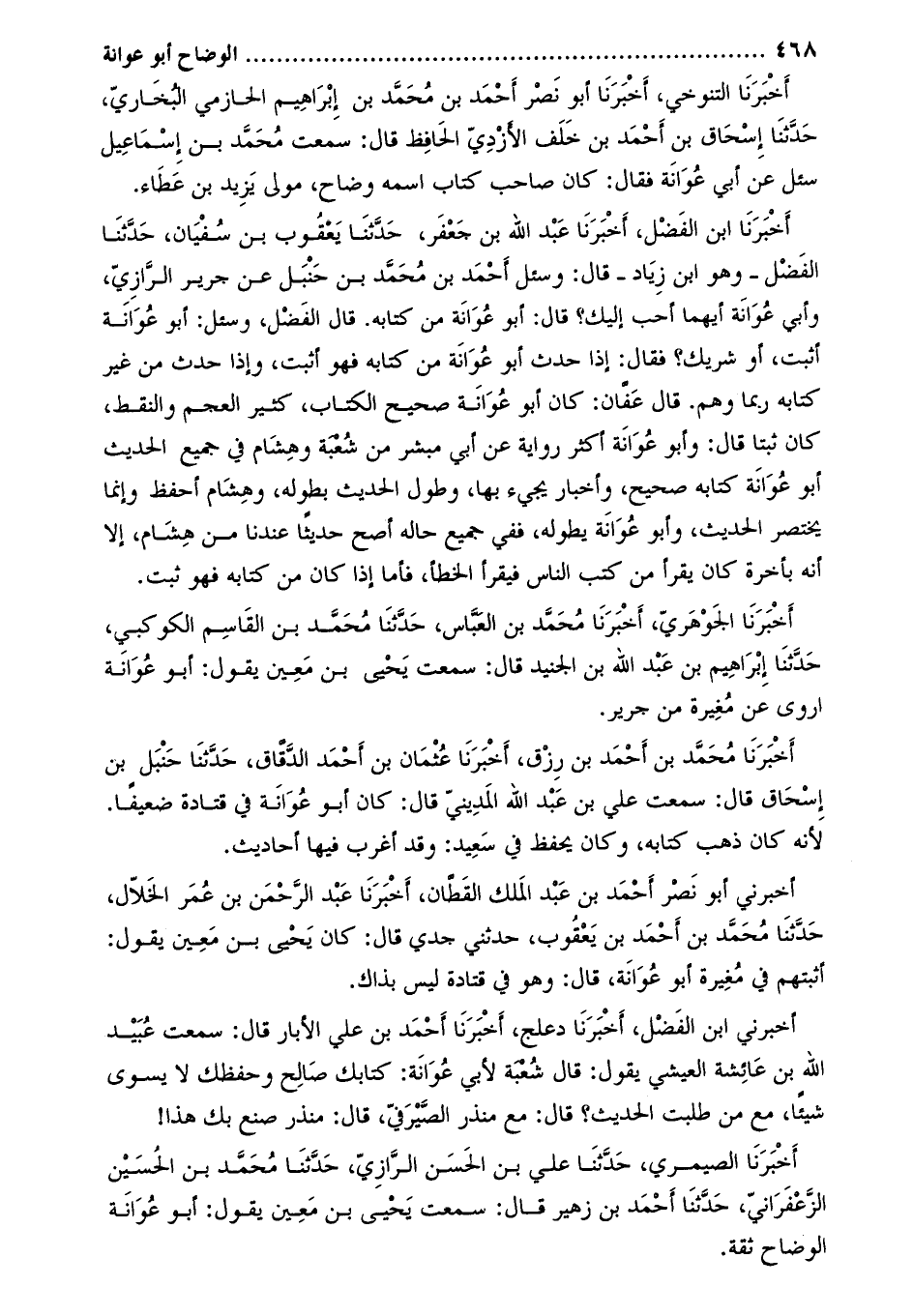 أَخْبَرَنَا ابْن الْفَضْل، أَخْبَرَنَا عَبْدُ اللَّهِ بْنُ جَعْفَرٍ، حَدَّثَنَا يعقوب بن سفيان، حَدَّثَنَا الفضل- وَهُوَ ابن زياد- قَالَ: وسئل أَحْمَد بْن مُحَمَّد بْن حَنْبَل عَنْ جرير الرَّازِيّ، وَأَبِي عَوَانَة أيهما أحب إليك؟ قَالَ: أَبُو عَوَانَة من كتابه. قَالَ الفضل، وسئل: أَبُو عَوَانَة أثبت، أَوْ شريك؟ فَقَالَ: إِذَا حدث أَبُو عَوَانَة من كتابه فَهُوَ أثبت، وَإِذَا حدث من غير كتابه ربما وهم. قَالَ عَفَّان: كَانَ أَبُو عَوَانَة صحيح الكتاب، كثير العجم والنقط، كَانَ ثبتا قال: وأبو عوانة أكثر رواية عن أبي مبشر من شعبة وهشام في جميع الحديث أَبُو عوانة كتابه صحيح، وأخبار يجيء بها، وطول الحديث بطوله، وهشام أحفظ وإنما يختصر الحديث، وأبو عوانة يطوله، ففي جميع حاله أصح حديثا عندنا من هشام، إلا أنه بأخرة كان يقرأ من كتب الناس فيقرأ الخطأ، فأما إذا كان من كتابه فهو ثبت.