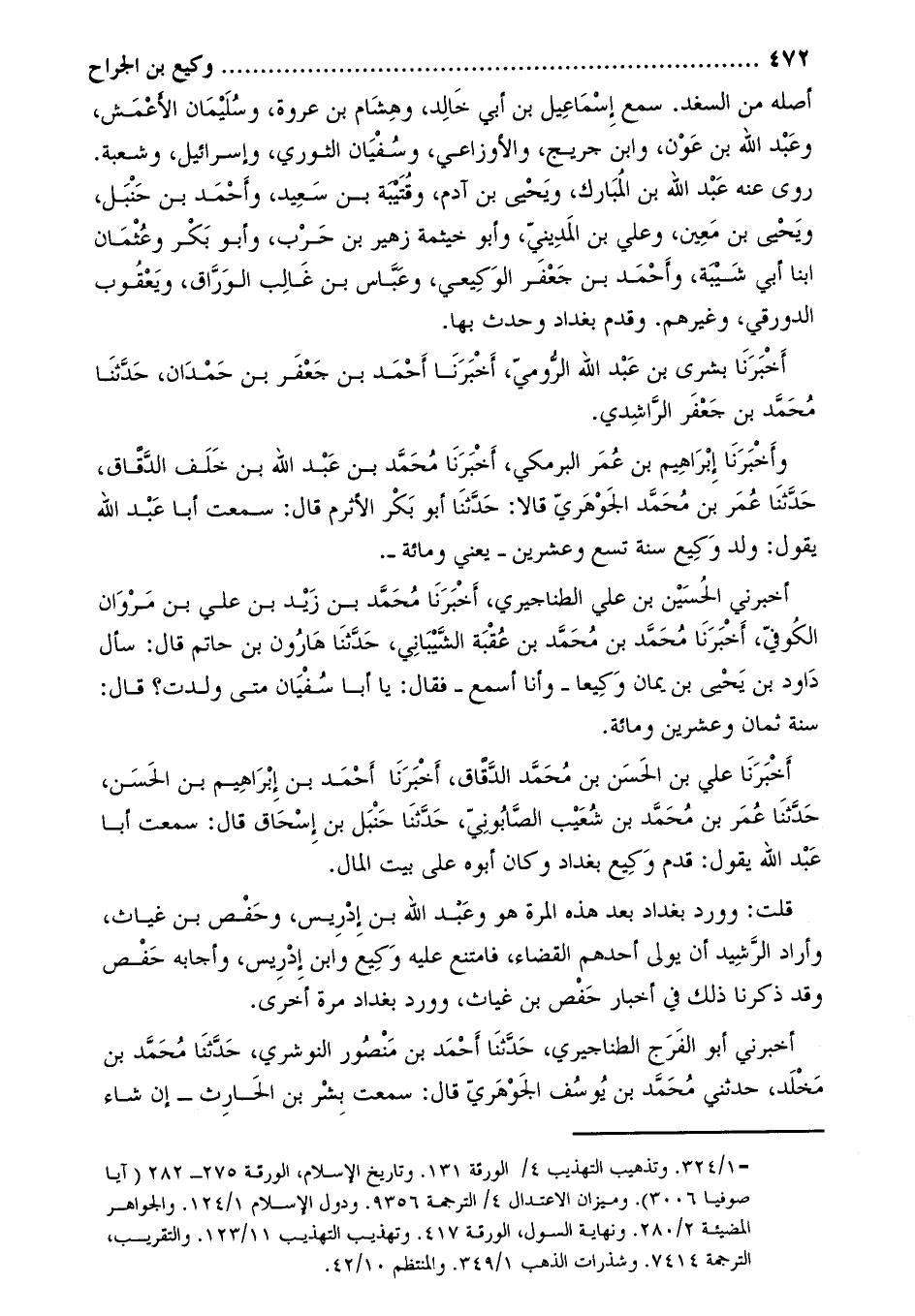 قلت: وورد بغداد بعد هذه المرة هو وَعَبْد اللَّهِ بْن إِدْرِيس، وحفص بْن غياث، وأراد الرشيد أن يولي أحدهم القضاء، فامتنع عليه وكيع وابن إدريس، وأجابه حفص وقد ذكرنا ذلك في أخبار حفص بن غياث، وورد بغداد مرة أخرى.