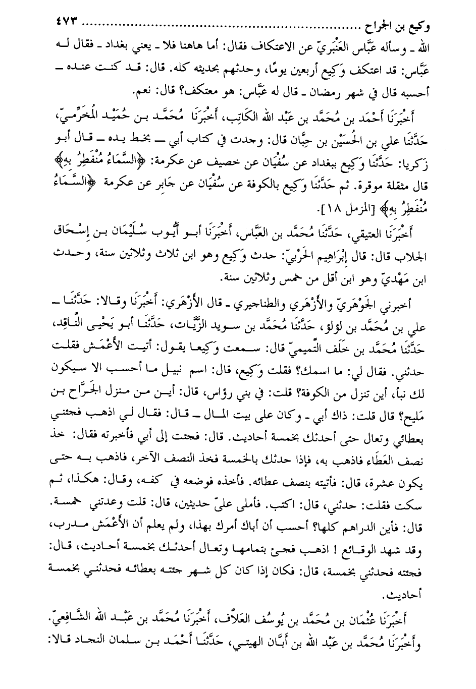أخبرني الجوهريّ والأزهريّ والطناجيري- قال الأزهري: أَخْبَرَنَا وقالا: حَدَّثَنَا- علي بن مُحَمَّد بن لؤلؤ، حدّثنا محمّد بن سويد الزّيّات، حدّثنا أبو يحيى النّاقد، حدّثنا محمّد بن خلف التّميميّ قال: سمعت وكيعا يقول: أتيت الأعمش فقلت حَدَّثَنِي. فقال لي: ما اسمك؟ فقلت وكيع، قال: اسم نبيل ما أحسب إلا سيكون لك نبأ، أين تنزل من الكوفة؟ قلت: في بني رؤاس، قال: أين من منزل الجراح بن مليح؟ قال قلت: ذاك أبي- وكان على بيت المال- قال: فقال لي اذهب فجئني بعطائي وتعال حتى أحدثك بخمسة أحاديث. قال: فجئت إلى أبي فأخبرته فقال: خذ نصف العطاء فاذهب به، فإذا حدثك بالخمسة فخذ النصف الآخر، فاذهب به حتى يكون عشرة، قال: فأتيته بنصف عطائه. فأخذه فوضعه في كفه، وقال: هكذا، ثم سكت فقلت: حَدَّثَنِي، قال: اكتب. فأملى علي حديثين، قال: قلت وعدتني خمسة.
