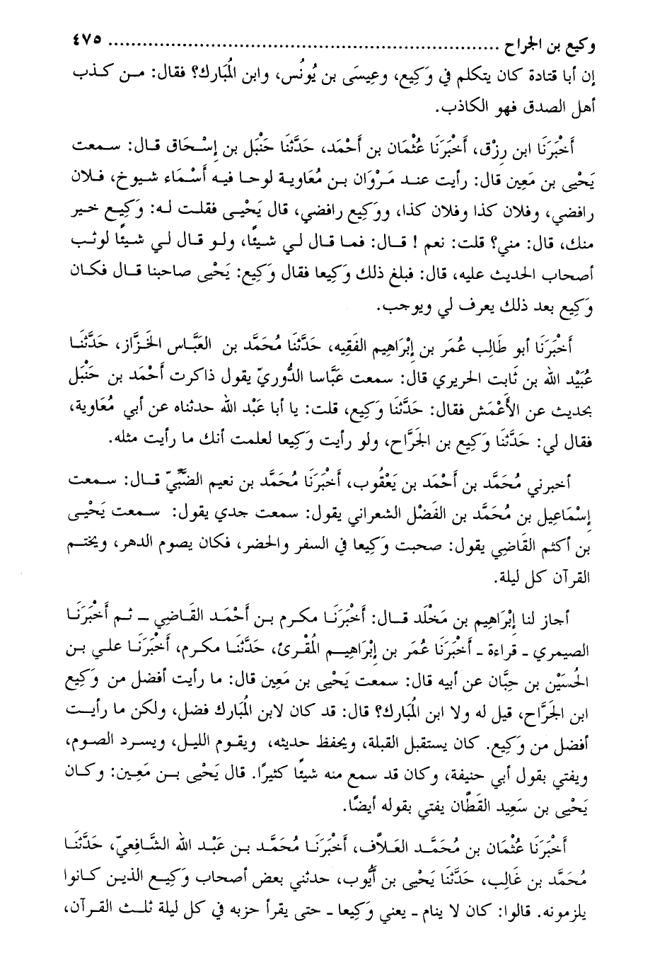 أخبرنا عثمان بن محمّد الْعَلافُ، أَخْبَرَنَا مُحَمَّدُ بْنُ عَبْدِ اللَّهِ الشَّافِعِيُّ، حدّثنا محمّد بن غالب، حدّثنا يحيى بن أيّوب، حَدَّثَنِي بعض أصحاب وكيع الذين كانوا يلزمونه. قالوا: كان لا ينام- يعني وكيعا- حتى يقرأ حزبه في كل ليلة ثلث القرآن،