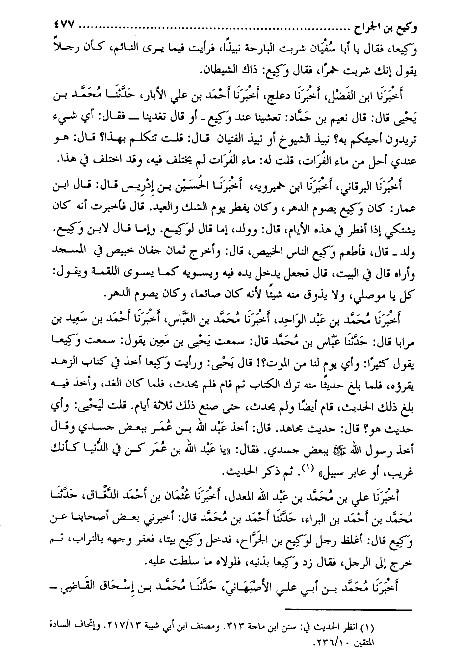 أَخْبَرَنَا مُحَمَّدُ بْنُ عَبْدِ الْوَاحِدِ، أخبرنا محمد بن العبّاس، أَخْبَرَنَا أحمد بن سعيد بن مرابا قَالَ: حَدَّثَنَا عباس بن محمد قَالَ: سمعت يحيى بْنَ مَعِينٍ يَقُولُ: سَمِعْتُ وَكِيعًا يَقُولُ كَثِيرًا: وَأَيُّ يَوْمٍ لَنَا مِنَ الْمَوْتِ؟! قَالَ يَحْيَى: ورأيت وكيعا أخذ في كتاب الزهد يقرؤه، فَلَمَّا بَلَغَ حَدِيثًا مِنْهُ تَرَكَ الْكِتَابَ ثُمَّ قَامَ فَلَمْ يُحَدِّثْ، فَلَمَّا كَانَ الْغَدُ، وَأَخَذَ فِيهِ بَلَغَ ذَلِكَ الْحَدِيثَ، قَامَ أَيْضًا وَلَمْ يُحَدِّثْ، حَتَّى صَنَعَ ذَلِكَ ثَلاثَةَ أَيَّامٍ. قُلْتُ لِيَحْيَى: وَأَيُّ حَدِيثٍ هُوَ؟ قَالَ: حَدِيثُ مُجَاهِدٍ. قَالَ: أَخَذَ عَبْدُ اللَّهِ بْنُ عُمَرَ بِبَعْضِ جَسَدِي وقَالَ أَخَذَ رَسُولُ اللَّهِ صَلَّى اللَّهُ عَلَيْهِ وَسَلَّمَ بِبَعْضِ جَسَدِي. فَقَالَ: «يَا عَبْدَ اللَّهِ بْنَ عُمَرَ كُنْ فِي الدُّنْيَا كَأَنَّكَ غَرِيبٌ، أَوْ عَابِرُ سَبِيلٍ» [1] .