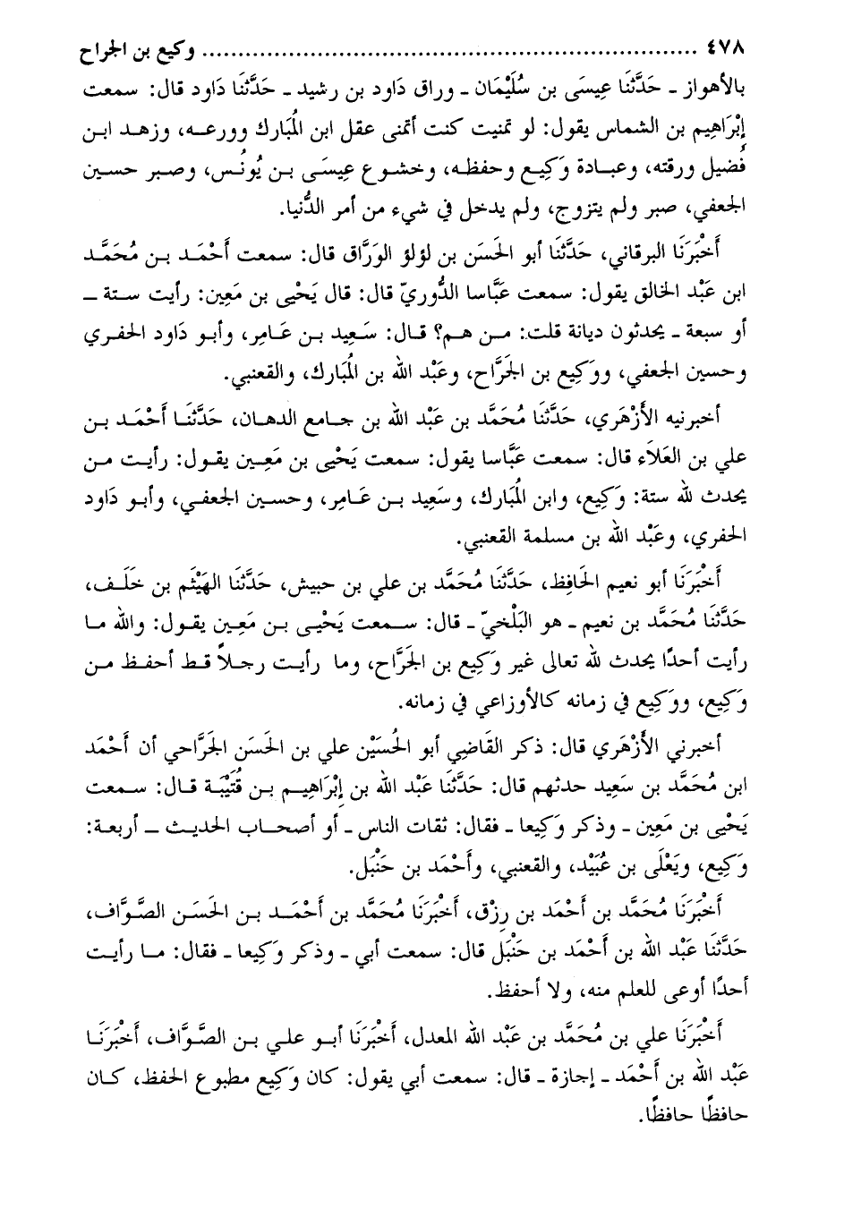 أَخْبَرَنَا مُحَمَّد بْن أَحْمَد بْن رزق، أخبرنا محمد بن أحمد بن الحسن الصواف، حدثنا عَبْد اللَّه بْن أَحْمَد بْن حنبل قَالَ: سمعت أبي- وذكر وكيعا- فقال: ما رأيت أحدا أوعى للعلم منه، ولا أحفظ.