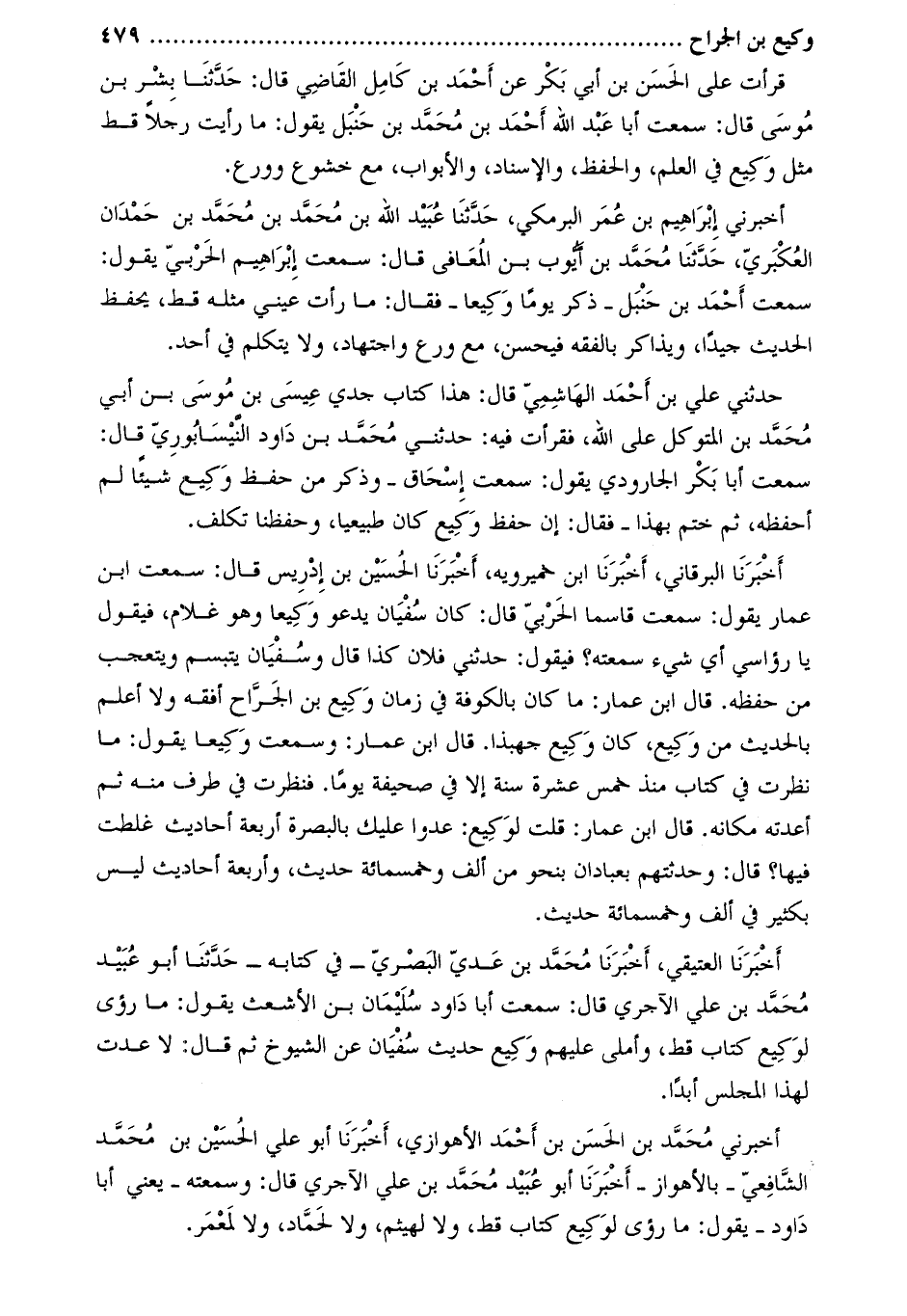 أخبرنا البرقاني، أخبرنا ابن حميرويه، أخبرنا الحسين بْن إدريس قَالَ: سمعت ابْن عمار يقول: سمعت قاسما الحربيّ قال: كان سفيان يدعو وكيعا وهو غلام، فيقول يا رؤاسي أي شيء سمعته؟ فيقول: حَدَّثَنِي فلان كذا قال وسفيان يتبسم ويتعجب من حفظه. قال ابن عمار: ما كان بالكوفة في زمان وكيع بن الجراح أفقه ولا أعلم بالحديث من وكيع، كان وكيع جهبذا. قال ابن عمار: وسمعت وكيعا يقول: ما نظرت في كتاب منذ خمس عشرة سنة إلا في صحيفة يوما. فنظرت في طرف منه ثم أعدته مكانه. قال ابن عمار: قلت لوكيع: عدوا عليك بالبصرة أربعة أحاديث غلطت فيها؟ قال: وحدثتهم بعبادان بنحو من ألف وخمسمائة حديث، وأربعة أحاديث ليس بكثير في ألف وخمسمائة حديث.