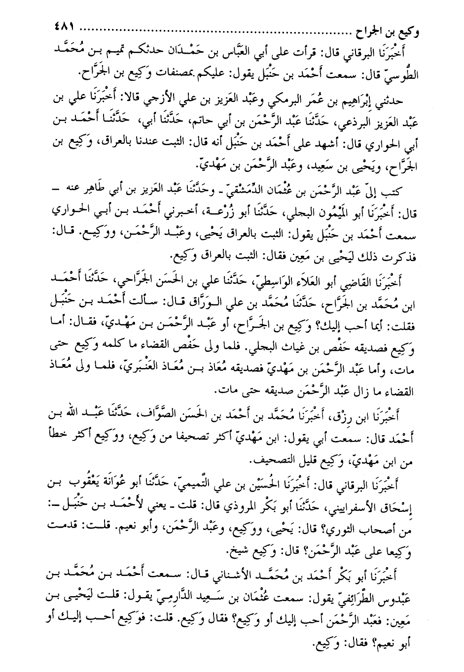 حَدَّثَنِي إبراهيم بن عُمَر البرمكي وعبد العزيز بن علي الأزجي قَالا: أَخْبَرَنَا عَلِيّ بْن عَبْد العزيز البرذعي، حدّثنا عبد الرّحمن بن أبي حاتم، حدّثنا أبي، حَدَّثَنَا أَحْمَد بن أبي الحواري قال: أشهد على أَحْمَد بن حنبل أنه قال: الثبت عندنا بالعراق، وكيع بن الجراح، ويحيى بن سعيد، وعَبْد الرَّحْمَن بن مهدي.