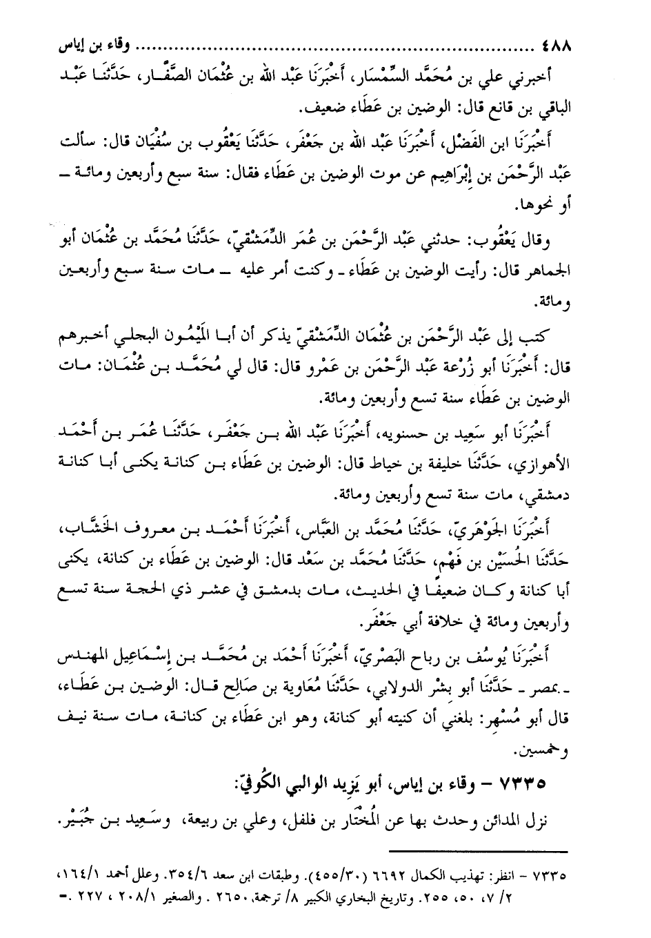 أَخْبَرَنَا أَبُو سعيد بْن حسنويه، أخبرنا عبد الله بن جعفر، حدّثنا عمر بن أحمد الأهوازي، حَدَّثَنَا خليفة بن خياط قال: الوضين بن عطاء بن كنانة يكنى أبا كنانة دمشقي، مات سنة تسع وَأربعين وَمائة.