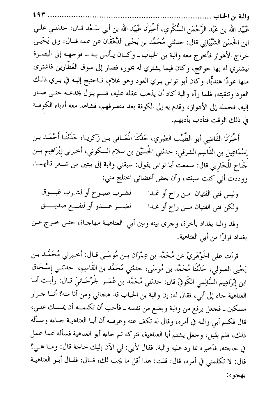 قرأت على الجوهري عَنْ مُحَمَّد بْن عمران بن موسى قَالَ: أخبرني محمّد بن يحيى الصولي، حدّثنا محمّد بن موسى، حدثني محمّد بن القاسم، حدثني إسحاق ابن إبراهيم السالمي الكوفي قال: حَدَّثَنِي مُحَمَّد بن عُمَر الجرجاني قال: رأيت أبا العتاهية جاء إلى أبي، فقال له: إن والبة بن الحباب قد هجاني ومن أنا منه؟ أنا جرار مسكين- فجعل يرفع من والبة ويضع من نفسه- فأحب أن تكلمه أن يمسك عني، قال فكلم أبي والبة في أمره، وقال له تكف عنه وعرفه أن أبا العتاهية جاءه وسأله ذلك، فلم يقبل، وجعل يشتم أبا العتاهية، فتركه ثم جاءه أَبُو العتاهية فسأله عما عمل في حاجته، فأخبره بما رد عليه والبة. فقال لأبي: لي الآن إليك حاجة قال: وما هي؟
