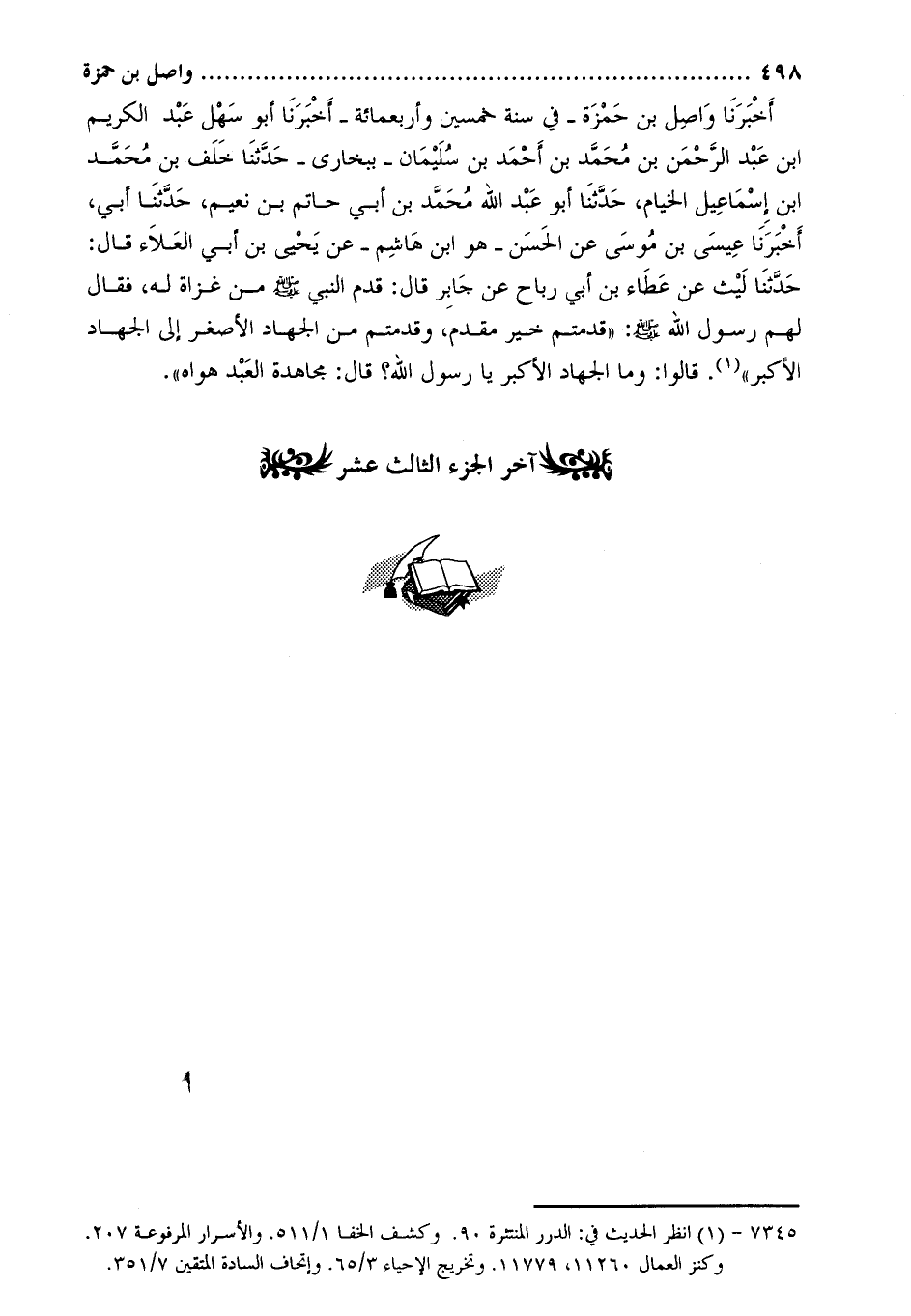 حَدَّثَنَا لَيْثٌ عَنْ عَطَاءِ بْنِ أَبِي رَبَاحٍ عَنْ جَابِرِ قَالَ: قَدِمَ النَّبِيُّ صَلَّى اللَّهُ عَلَيْهِ وَسَلَّمَ مِنْ غَزَاةٍ لَهُ، فَقَالَ لَهُمْ رَسُولُ اللَّهِ صَلَّى اللَّهُ عَلَيْهِ وَسَلَّمَ: «قَدِمْتُمْ خَيْرَ مَقْدَمٍ، وَقَدِمْتُمْ مِنَ الْجِهَادِ الأَصْغَرِ إِلَى الْجِهَادِ الأَكْبَرِ» [1] . قَالُوا: وَمَا الْجِهَادُ الأَكْبَرُ يَا رَسُولَ اللَّهِ؟ قَالَ: مُجَاهَدَةُ الْعَبْدِ هواه» .