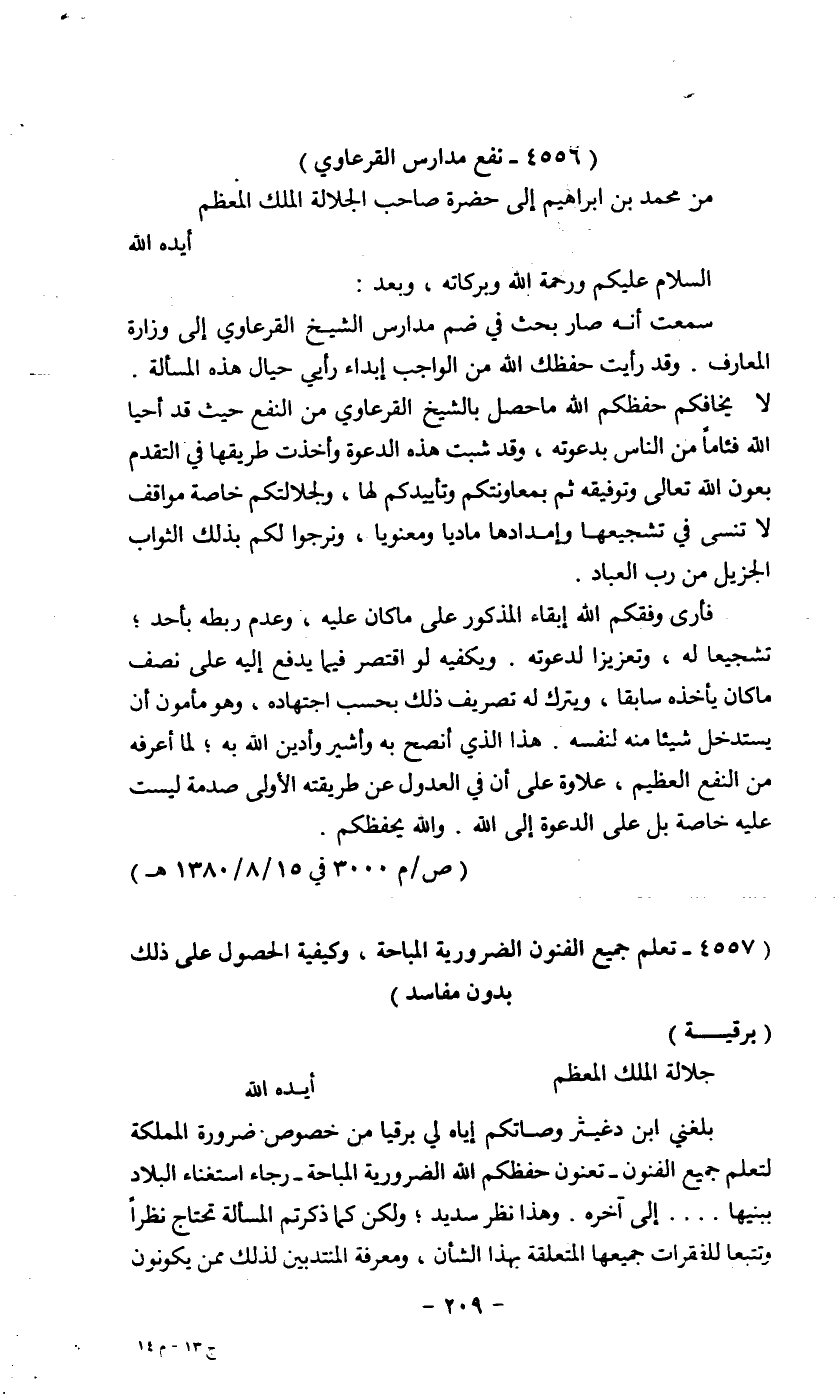 سمعت أنه صادر بحث في ضم مدارس الشيخ القرعاوي إلى وزارة المعارف، وقد رأيت حفظك الله من الواجب إبداء رأيي حيال هذه المسألة، لا يخافكم حفظكم الله ما حصل بالشيخ القرعاوي من النفع حيث قد أحيا الله فئاماً من الناس بدعوته، وقد شبت هذه الدعوة وأخذت طريقها في التقدم بعون الله تعالى وتوفيقه ثم بمعاونتكم وتأييدكم لها، ولجلالتكم خاصة مواقف لا تنسى في تشجيعها وإمدادها مادياً ومعنوياً، ونرجو لكم بذلك الثواب الجزيل من رب العباد.