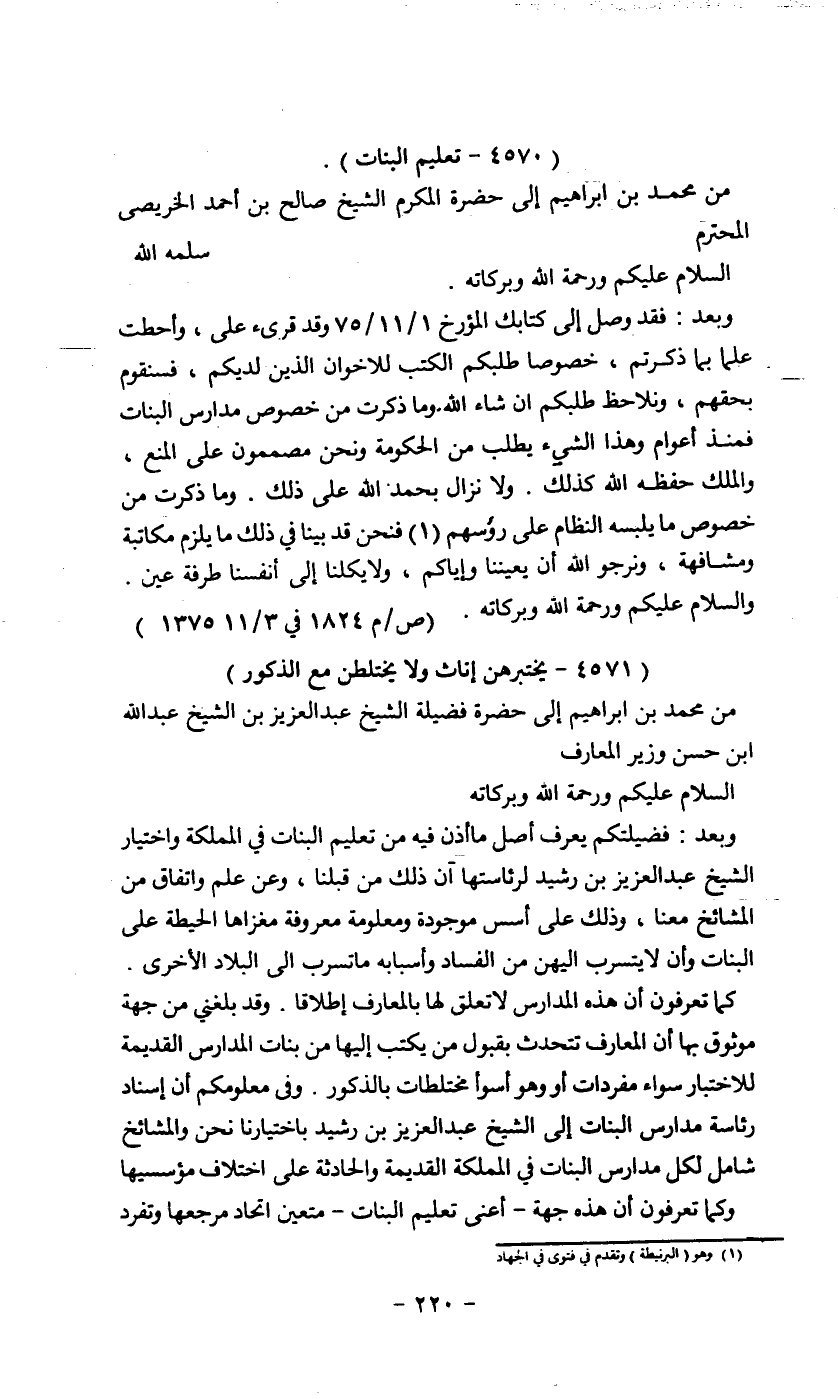وبعد: فضيلتك يعرف أصل ما أذن فيه من تعليم البنات في المملكة واختيار الشيخ عبد العزيز بن رشيد لرئاستها آن ذلك من قبلنا، وعن علم واتفاق من المشائخ معنا، وذلك على أسس موجودة ومعلومة معروفة مغزاها الحيطة على البنات وأن لا يتسرب إليهن من الفساد وأسبابه ما تسرب إلى البلاد الأخرى.