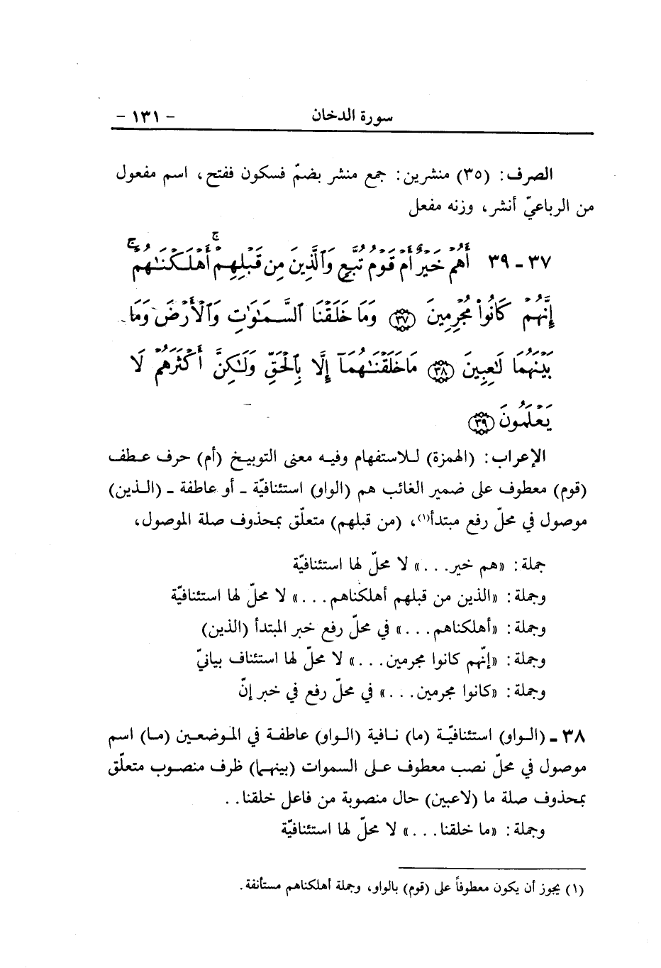 (بل) حرف إضراب (لله) جارّ ومجرور متعلّق بخبر مقدّم (الأمر) مبتدأ مؤخّر مرفوع (جميعا) حال منصوبة من الأمر، والعامل فيه معنى الاستقرار (الهمزة) للاستفهام (الفاء) عاطفة (لم) حرف نفي وجزم (ييئس) مضارع مجزوم (الذين) اسم موصول مبنيّ في محلّ رفع فاعل (آمنوا) فعل ماض وفاعله (أن) مخفّفة من الثقيلة «1» ، واسمها ضمير الشأن محذوف (لو) مثل الأولى (يشاء) مضارع مرفوع (الله) لفظ الجلالة فاعل مرفوع (اللام) واقعة في جواب لو (هدى) فعل ماض مبنيّ على الفتح المقدّر على الألف، والفاعل هو (الناس) مفعول به منصوب (جميعا) حال من الناس منصوبة.