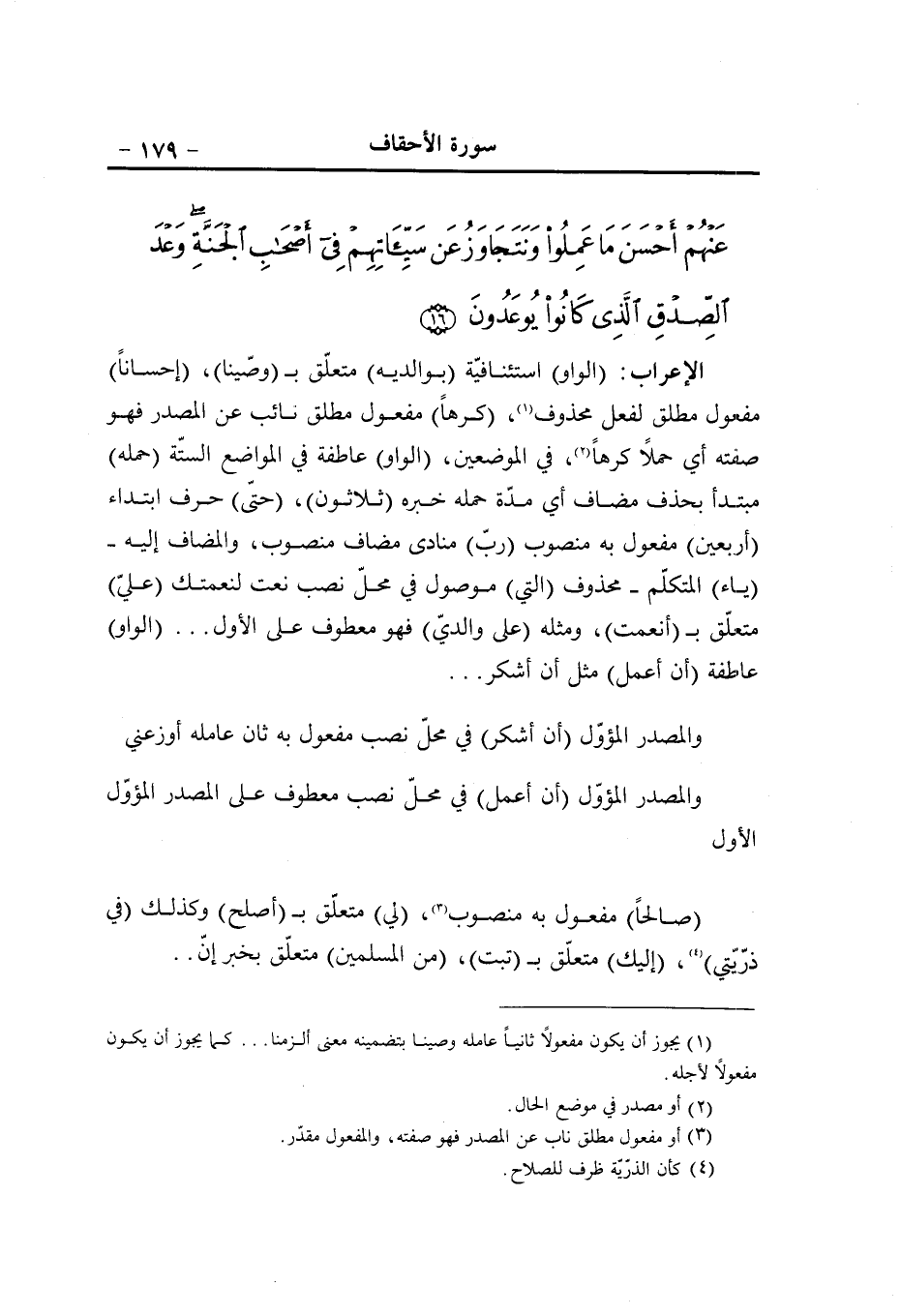 (الواو) استئنافيّة (قال الشيطان) مثل قال الضعفاء «1» ، (لمّا) ظرف متضمّن معنى الشرط بمعنى حين مبني في محلّ نصب متعلّق بمضمون الجواب (قضي) فعل ماض مبنيّ للمجهول (الأمر) نائب الفاعل (إنّ) حرف توكيد ونصب (الله) لفظ الجلالة اسم إنّ منصوب (وعدكم) فعل ماض، و (كم) ضمير مفعول به، والفاعل هو (وعد) مفعول به ثان منصوب (الحقّ) مضاف إليه مجرور (الواو) عاطفة (وعدتكم) فعل، وفاعل، ومفعول به (الفاء) عاطفة (أخلفتكم) مثل وعدتكم والمفعول الثاني محذوف أي أخلفتكم الوعد (الواو) عاطفة (ما) حرف نفي (كان) فعل ماض ناقص (اللام) حرف جرّ و (الياء) ضمير في محلّ جرّ متعلّق بمحذوف خبر كان (على) حرف جرّ و (كم) ضمير في محلّ جرّ متعلّق بحال من سلطان (من) حرف جرّ زائد (سلطان) مجرور لفظا مرفوع محلّا اسم كان (إلّا) أداة استثناء (أن) حرف مصدريّ (دعوتكم) مثل وعدتكم (الفاء) عاطفة (استجبتم) فعل ماض وفاعله (لي) مثل الأول متعلّق ب (استجبتم) .