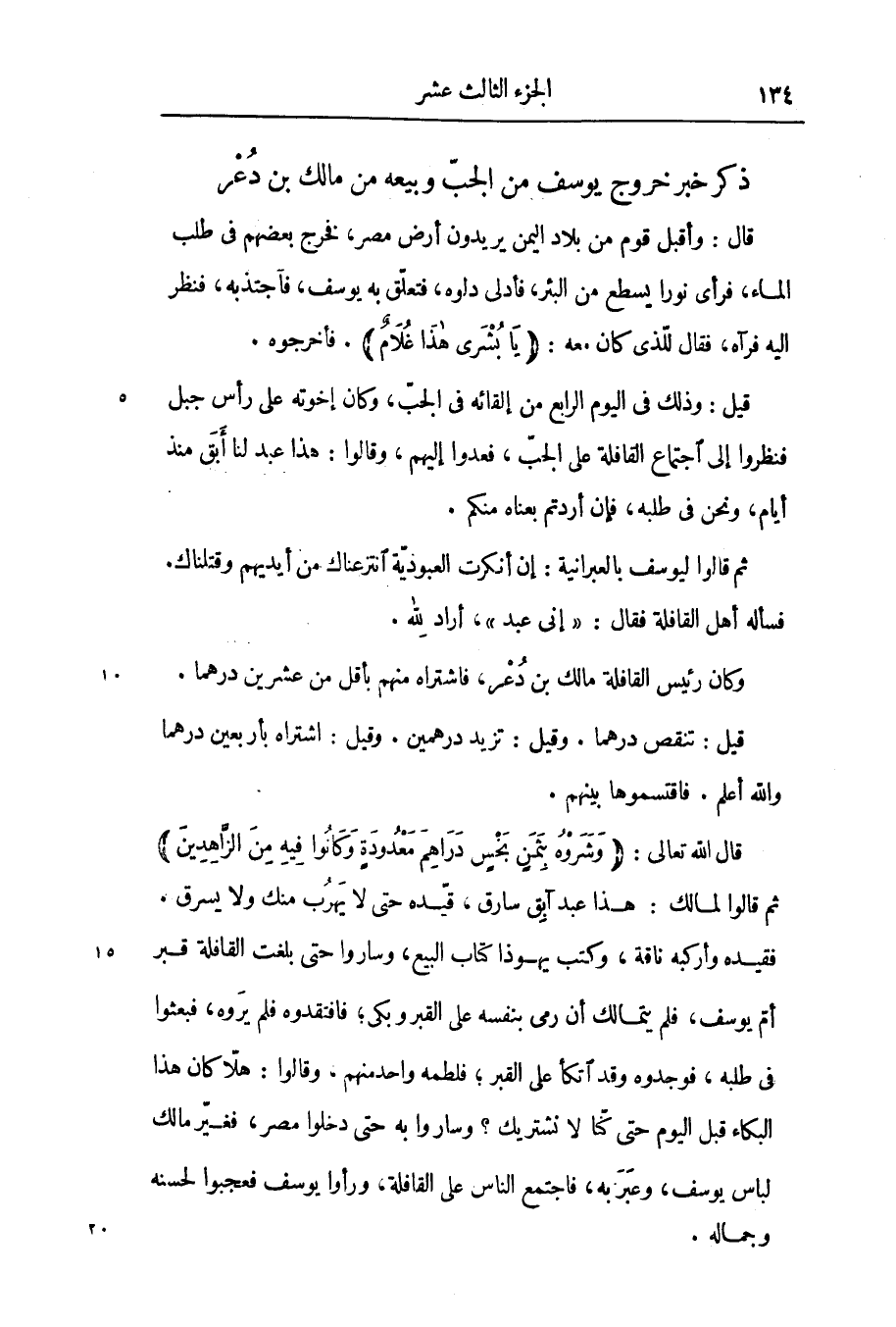 قال: وأقبل قوم من بلاد اليمن يريدون أرض مصر، فخرج بعضهم فى طلب الماء، فرأى نورا يسطع من البئر، فأدلى دلوه، فتعلّق به يوسف، فآجتذبه، فنظر اليه فرآه، فقال للّذى كان معه: يا بُشْرى هذا غُلامٌ