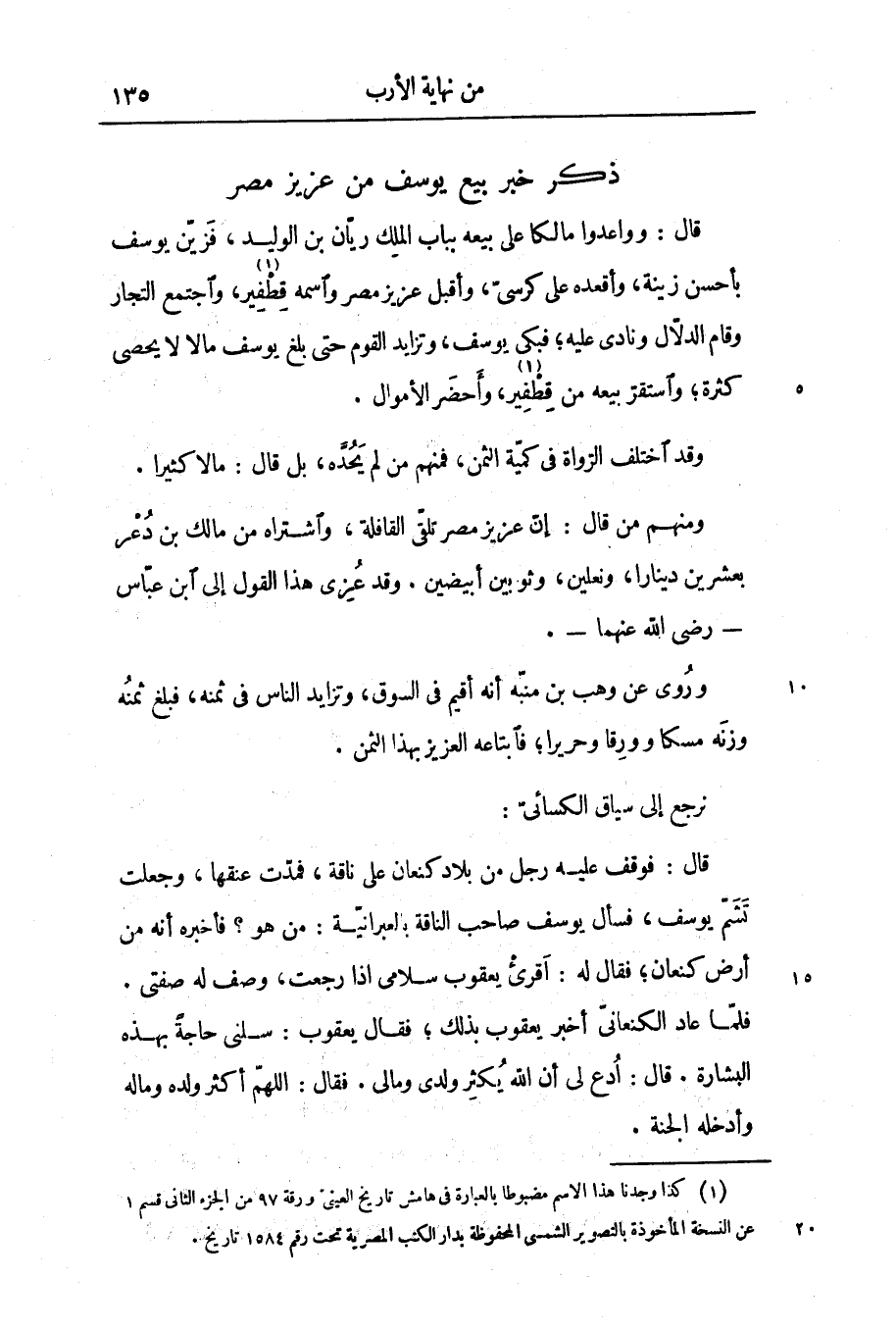 ومنهم من قال: إنّ عزيز مصر تلقّى القافلة، واشتراه من مالك بن دعر بعشرين دينارا، ونعلين، وثوبين أبيضين. وقد عزى هذا القول إلى ابن عبّاس- رضى الله عنهما-.