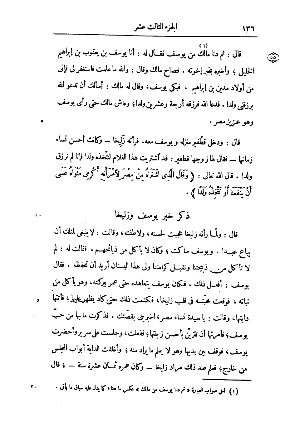 قال: ولمّا رأته زليخا عجبت لحسنه، ولا طفته، وقالت: لا ينبغى لمثلك أن يباع عبدا. ويوسف ساكت؛ وكان لا يأكل من ذبائحهم، فقالت له: لم لا تأكل من ذبيحتنا وتقبل كرامتنا ولى هذا البستان أريد أن تحفظه. فقال يوسف: أفعل ذلك. فكان يوسف يتعاهده حتى عمر ببركته، وهو يأكل من نباته، فوقعت محبّته فى قلب زليخا، فكتمت ذلك حتى كاد يظهر عليها، فأتتها دايتها، وقالت: يا سيدة نساء مصر، اخبرينى بقصّتك. فذكرت ما بها من حبّ يوسف؛ فأمرتها أن تتزيّن بأحسن زينتها؛ ففعلت، وجلست على سرير وأحضرت يوسف، فوقف بين يديها وهو لا يعلم ما يراد منه؛ وأغلقت الداية أبواب المجلس من خارج؛ فعلم عند ذلك مراد زليخا- وكان عمره ثمان عشرة سنة-؛ قال