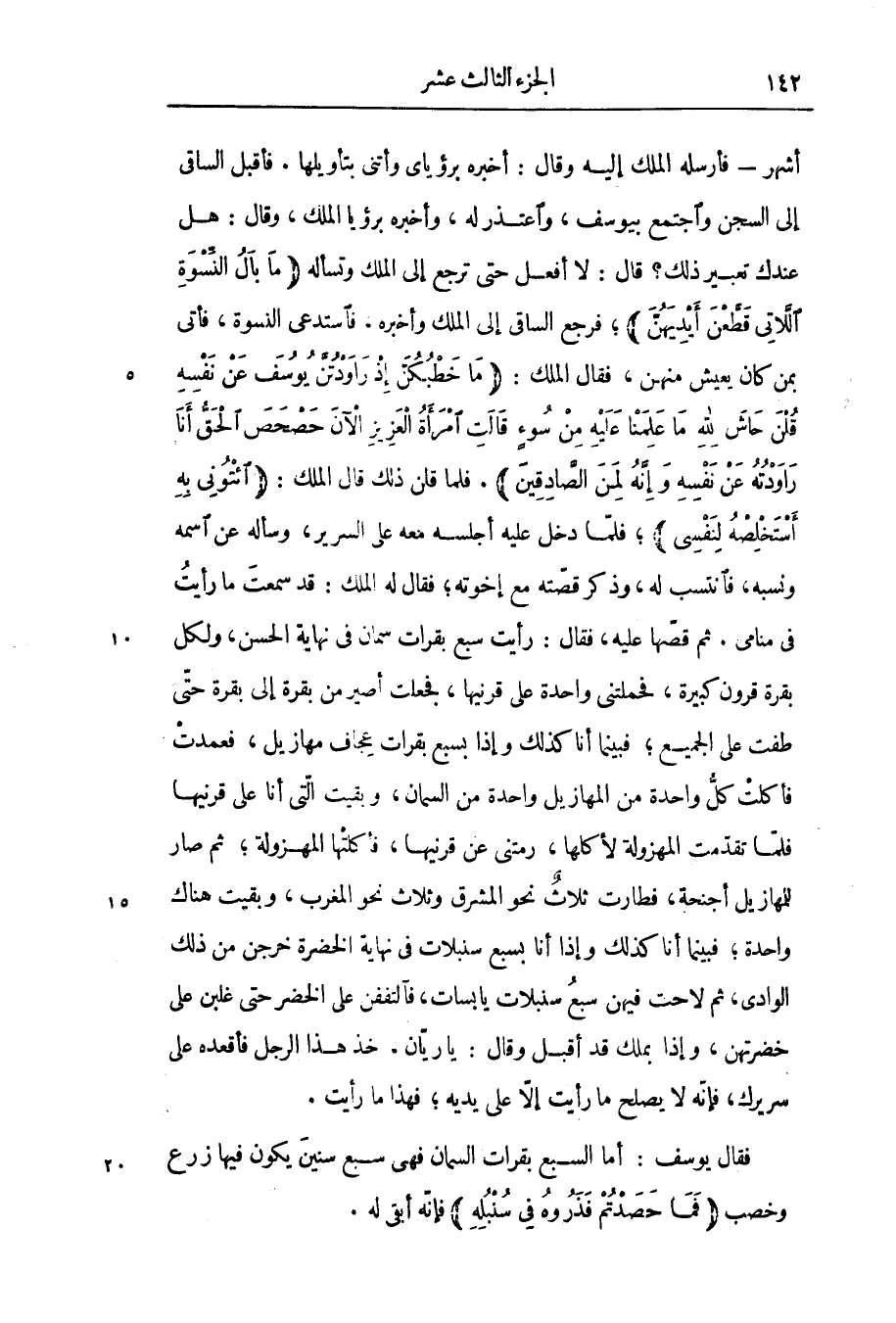 ؛ فرجع الساقى إلى الملك وأخبره. فاستدعى النسوة، فأتى بمن كان يعيش منهن، فقال الملك: ما خَطْبُكُنَّ إِذْ راوَدْتُنَّ يُوسُفَ عَنْ نَفْسِهِ قُلْنَ حاشَ لِلَّهِ ما عَلِمْنا عَلَيْهِ مِنْ سُوءٍ قالَتِ امْرَأَةُ الْعَزِيزِ الْآنَ حَصْحَصَ الْحَقُّ أَنَا راوَدْتُهُ عَنْ نَفْسِهِ وَإِنَّهُ لَمِنَ الصَّادِقِينَ