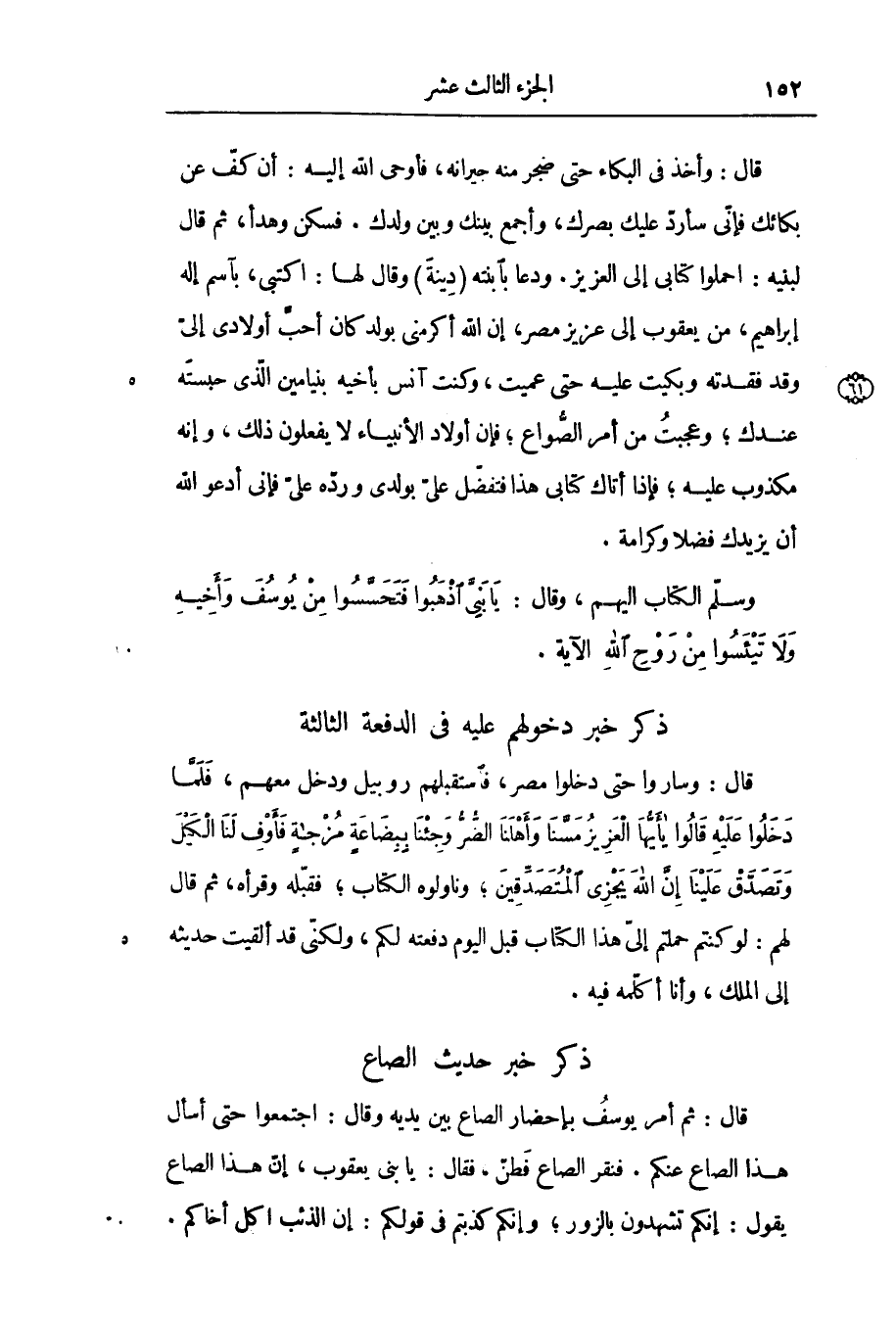 قال: ثم أمر يوسف بإحضار الصاع بين يديه وقال: اجتمعوا حتى أسأل هذا الصاع عنكم. فنقر الصاع فطنّ، فقال: يا بنى يعقوب، إنّ هذا الصاع يقول: إنكم تشهدون بالزور؛ وإنكم كذبتم فى قولكم: إن الذئب اكل أخاكم.