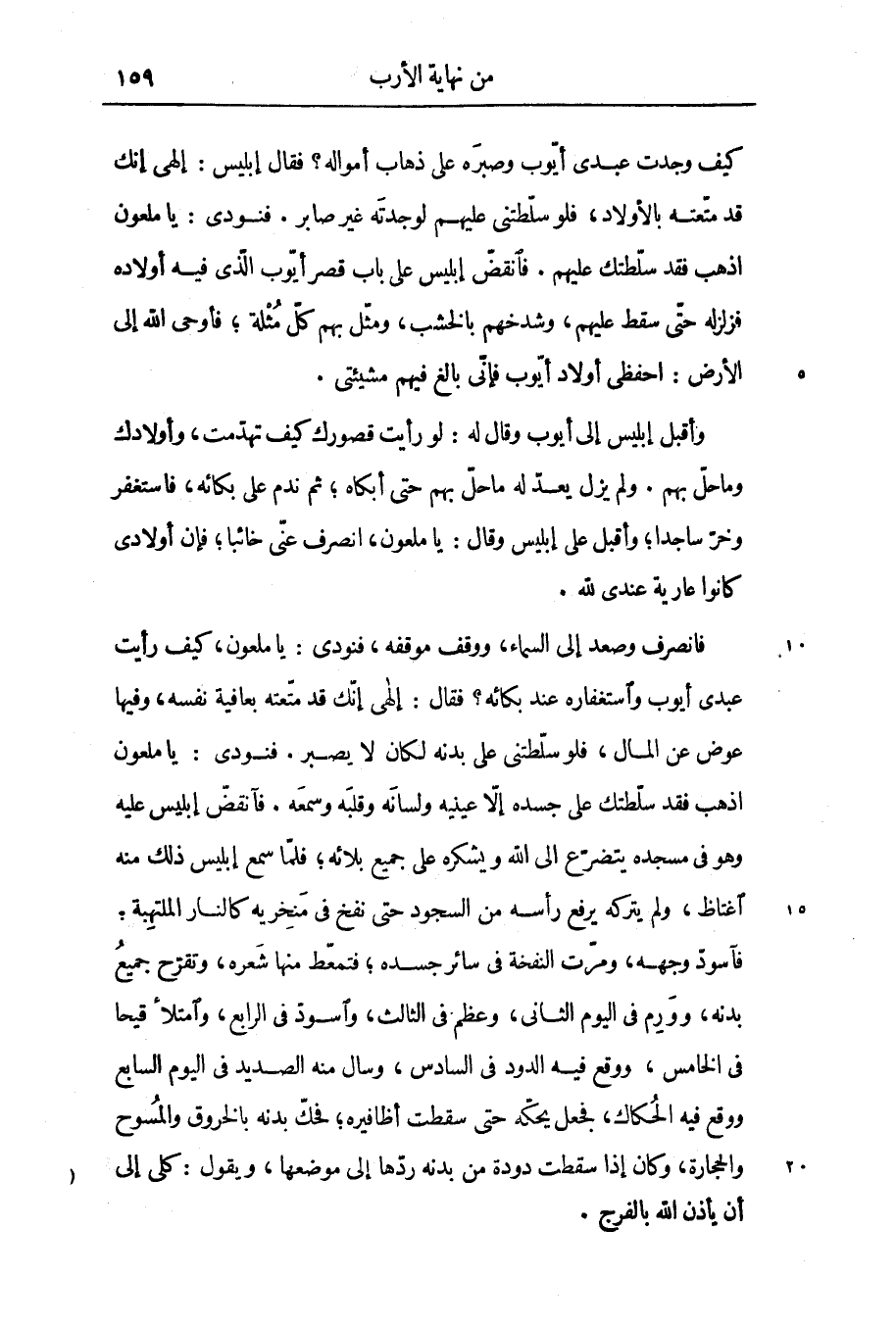 فانصرف وصعد إلى السماء، ووقف موقفه، فنودى: يا ملعون، كيف رأيت عبدى أيوب واستغفاره عند بكائه؟ فقال: إلهى إنّك قد متّعته بعافية نفسه، وفيها عوض عن المال، فلو سلّطتنى على بدنه لكان لا يصبر. فنودى: يا ملعون اذهب فقد سلّطتك على جسده إلّا عينيه ولسانه وقلبه وسمعه. فانقضّ إبليس عليه وهو فى مسجده يتضرّع الى الله ويشكره على جميع بلائه؛ فلمّا سمع إبليس ذلك منه اغتاظ، ولم يتركه يرفع رأسه من السجود حتى نفخ فى منخريه كالنار الملتهبة؛ فاسودّ وجهه، ومرّت النفخة فى سائر جسده؛ فتمعّط منها شعره، وتقرّح جميع بدنه، وورم فى اليوم الثانى، وعظم فى الثالث، واسودّ فى الرابع، وامتلأ قيحا فى الخامس، ووقع فيه الدود فى السادس، وسال منه الصديد فى اليوم السابع ووقع فيه الحكاك، فجعل يحكّه حتى سقطت أظافيره؛ فحكّ بدنه بالخروق والمسوح والحجارة، وكان إذا سقطت دودة من بدنه ردّها إلى موضعها، ويقول: كلى إلى أن يأذن الله بالفرج.