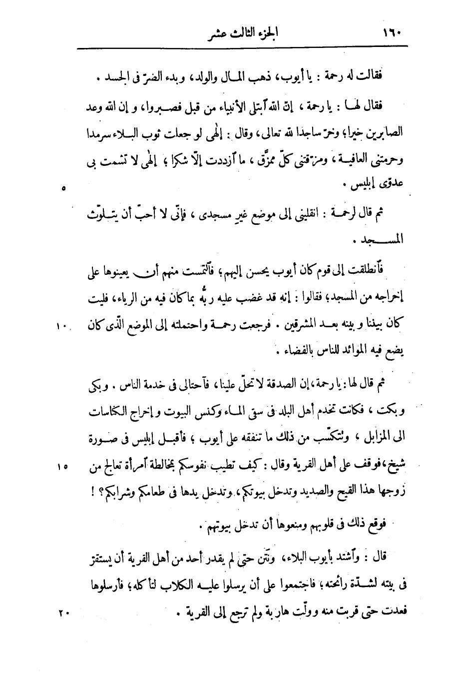 فقال لها: يا رحمة، إنّ الله ابتلى الأنبياء من قبل فصبروا، وإن الله وعد الصابرين خيرا؛ وخرّ ساجدا لله تعالى، وقال: إلهى لو جعلت ثوب البلاء سرمدا وحرمتنى العافية، ومزّقتنى كلّ ممزّق، ما ازددت إلّا شكرا؛ إلهى لا تشمت بى عدوّى إبليس.