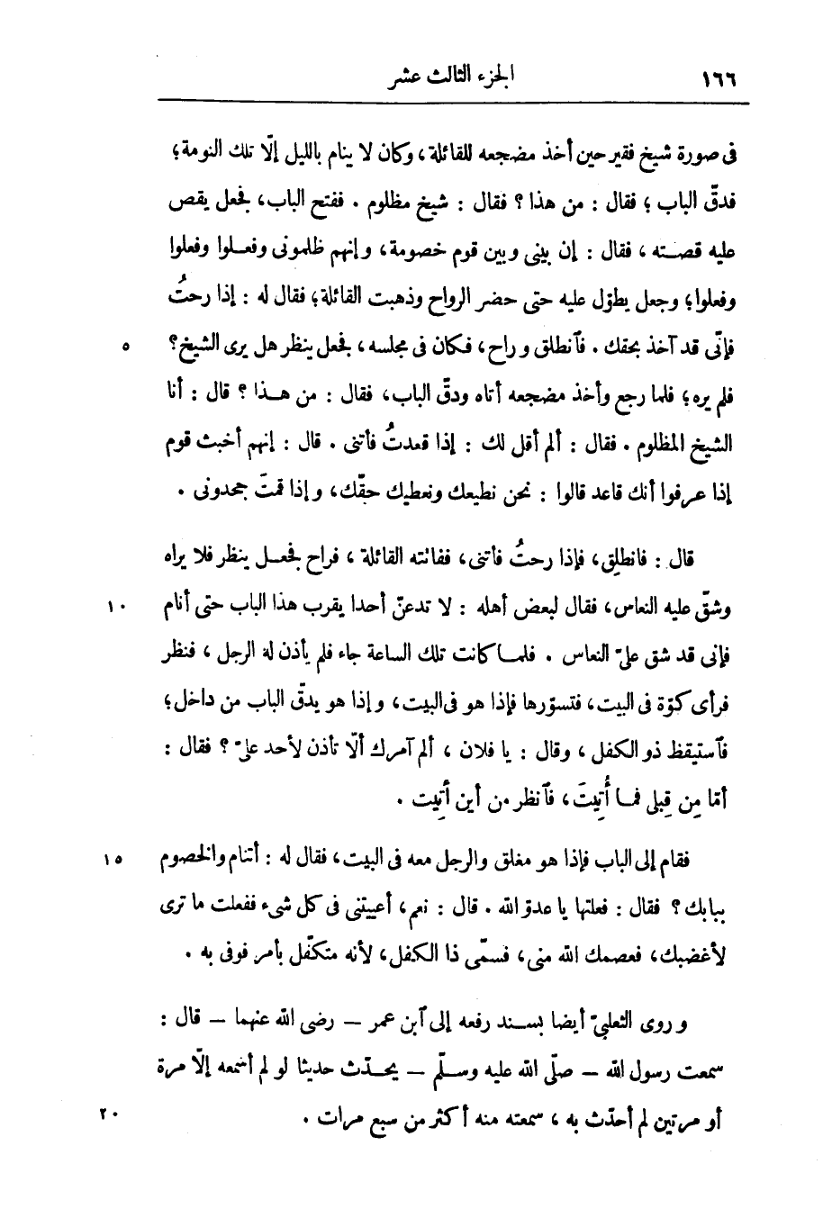 قال: فانطلق، فإذا رحت فأتنى، ففائته القائلة، فراح فجعل ينظر فلا يراه وشقّ عليه النعاس، فقال لبعض أهله: لا تدعنّ أحدا يقرب هذا الباب حتى أنام فإنى قد شق علىّ النعاس. فلما كانت تلك الساعة جاء فلم يأذن له الرجل، فنظر فرأى كوّة فى البيت، فتسوّرها فإذا هو فى البيت، وإذا هو يدقّ الباب من داخل؛ فاستيقظ ذو الكفل، وقال: يا فلان، ألم آمرك ألّا تأذن لأحد علىّ؟ فقال: