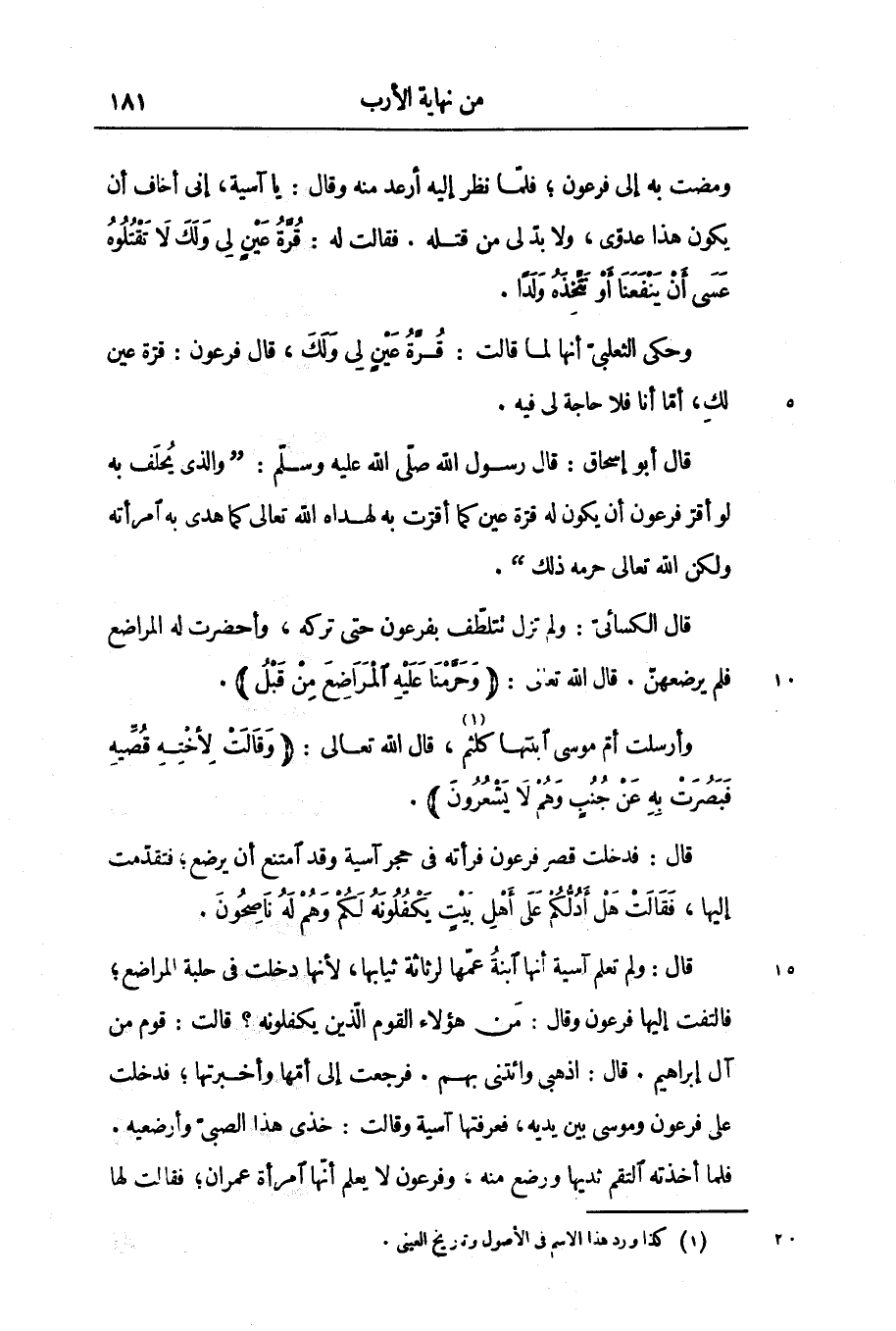 قال: ولم تعلم آسية أنها ابنة عمّها لرثائة ثيابها، لأنها دخلت فى حلبة المراضع؛ فالتفت إليها فرعون وقال: من هؤلاء القوم الّذين يكفلونه؟ قالت: قوم من آل إبراهيم. قال: اذهبى وائتنى بهم. فرجعت إلى أمّها وأخبرتها؛ فدخلت على فرعون وموسى بين يديه، فعرفتها آسية وقالت: خذى هذا الصبىّ وأرضعيه.