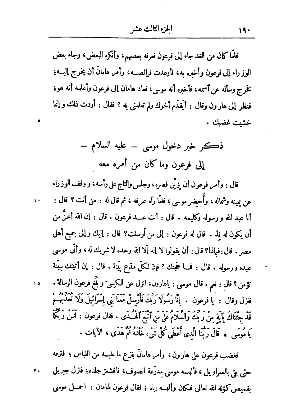 أنا عبد الله ورسوله وكليمه. قال: أنت عبد فرعون. قال: إن الله أعزّ من أن يكون له ندّ. قال له فرعون: إلى من أرسلت؟ قال: إليك وإلى جميع أهل مصر. قال: فبماذا؟ قال: أن يقولوا لا إله إلّا الله وحده لا شريك له، وأنّى موسى عبده ورسوله. قال: فما حجّتك؟ فإنّ لكلّ مدّع بيّنة. قال: إن أتيتك ببيّنة تؤمن؟ قال: نعم. قال موسى: يا هارون، انزل عن الكرسىّ وبلّغ فرعون الرسالة.
