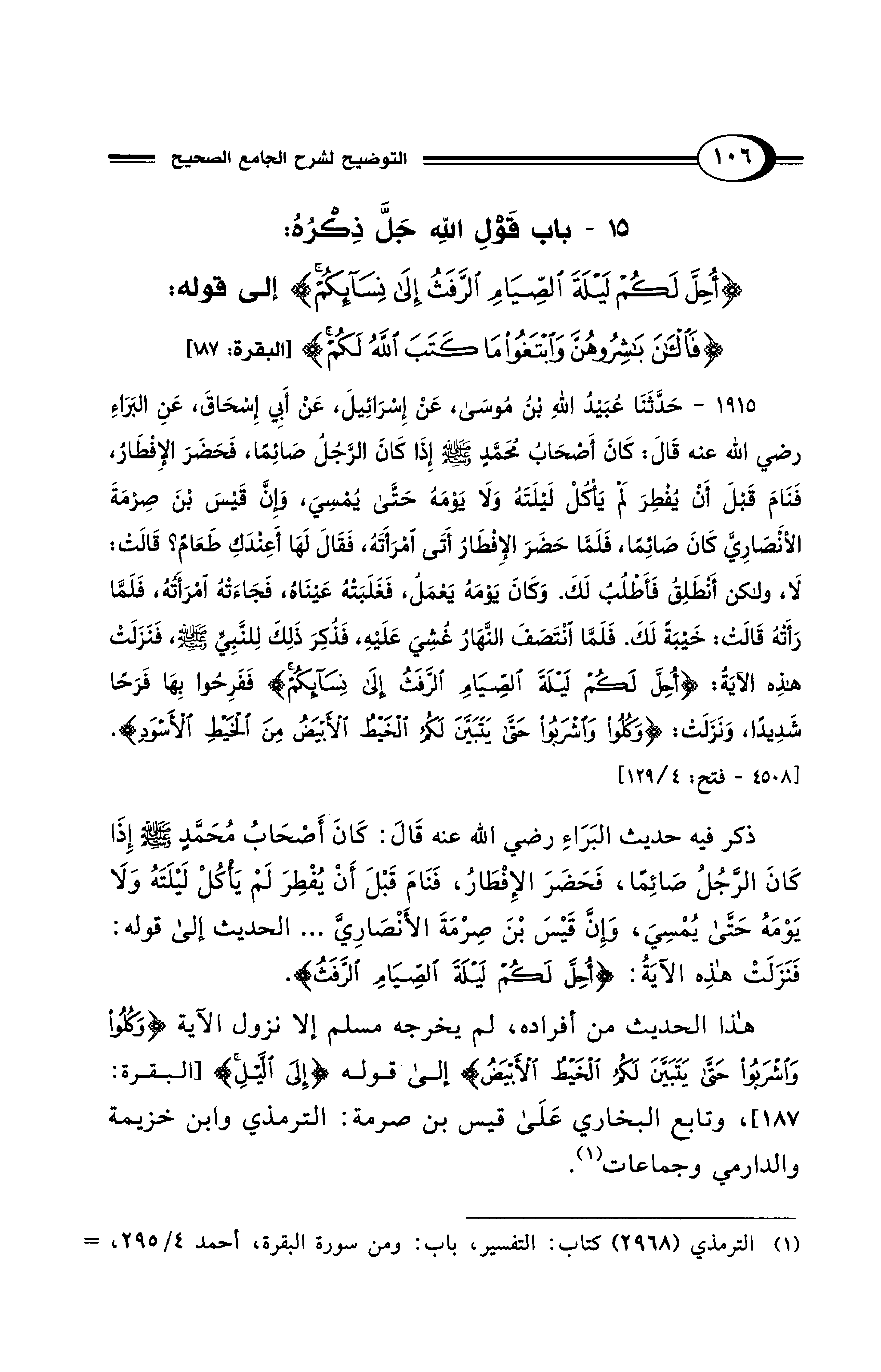 ذكر فيه حديث البَرَاءِ رضي الله عنه قَالَ: كَانَ أَصْحَابُ مُحَمَّدٍ - صلى الله عليه وسلم - إِذَا كَانَ الرَّجُلُ صَائِمًا، فَحَضَرَ الإِفْطَارُ، فَنَامَ قَبْلَ أَنْ يُفْطِرَ لَمْ يَأْكُلْ لَيْلَتَهُ وَلَا يَوْمَهُ حَتَّى يُمْسِيَ، وَإِنَّ قَيْسَ بْنَ صِرْمَةَ الأَنْصَارِيَّ ... الحديث إلى قوله: فَنَزَلَتْ هذِه الآيَةُ: {أُحِلَّ لَكُمْ لَيْلَةَ الصِّيَامِ الرَّفَثُ}.