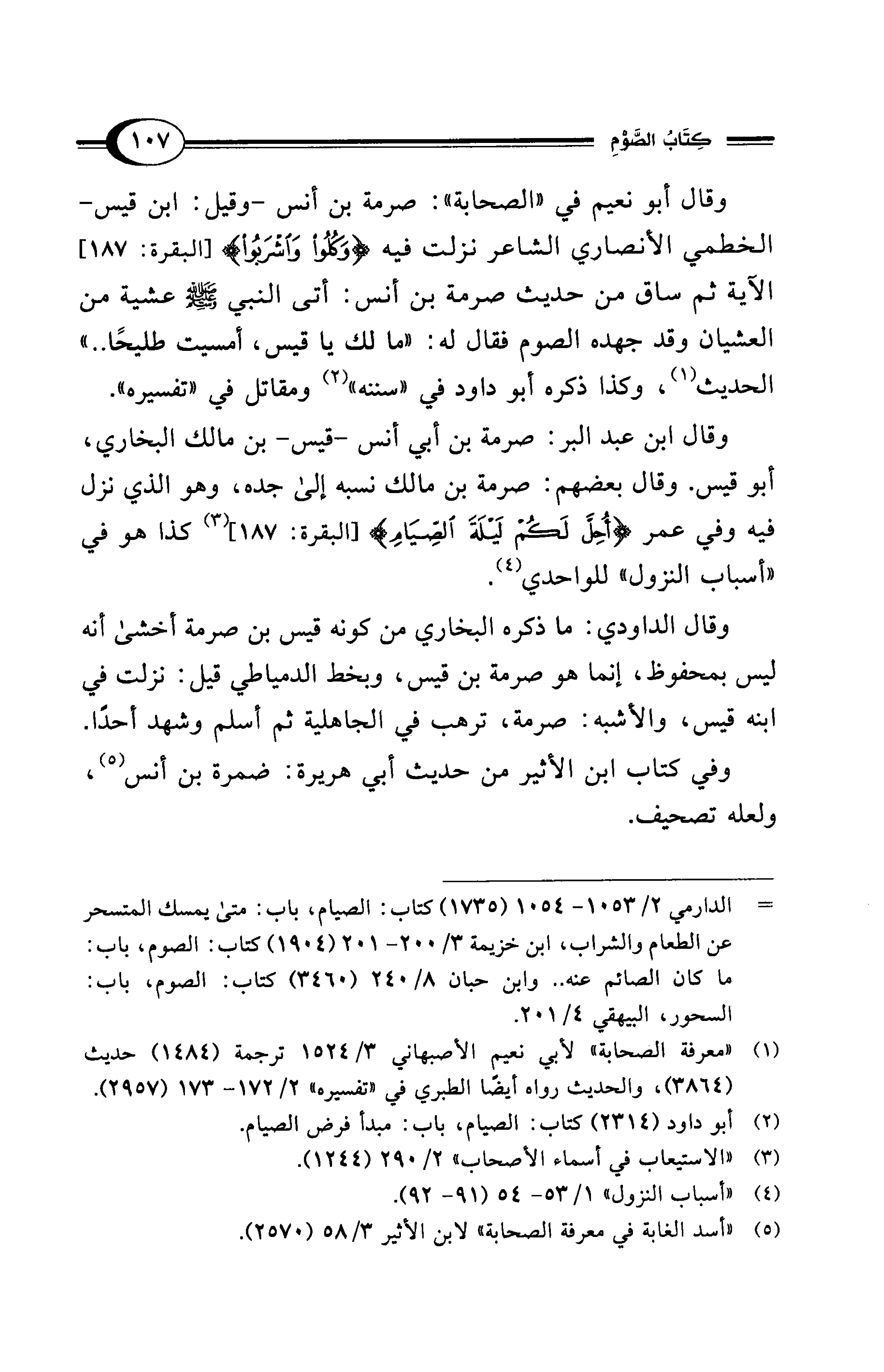 وقال ابن عبد البر: صرمة بن أبي أنس -قيس- بن مالك البخاري، أبو قيس. وقال بعضهم: صرمة بن مالك نسبه إلى جده، وهو الذي نزل فيه وفي عمر {أُحِلَّ لَكُم ليلَةَ اَلصِيَام} [البقرة: 187] (¬3) كذا هو في "أسباب النزول" للواحدي (¬4).