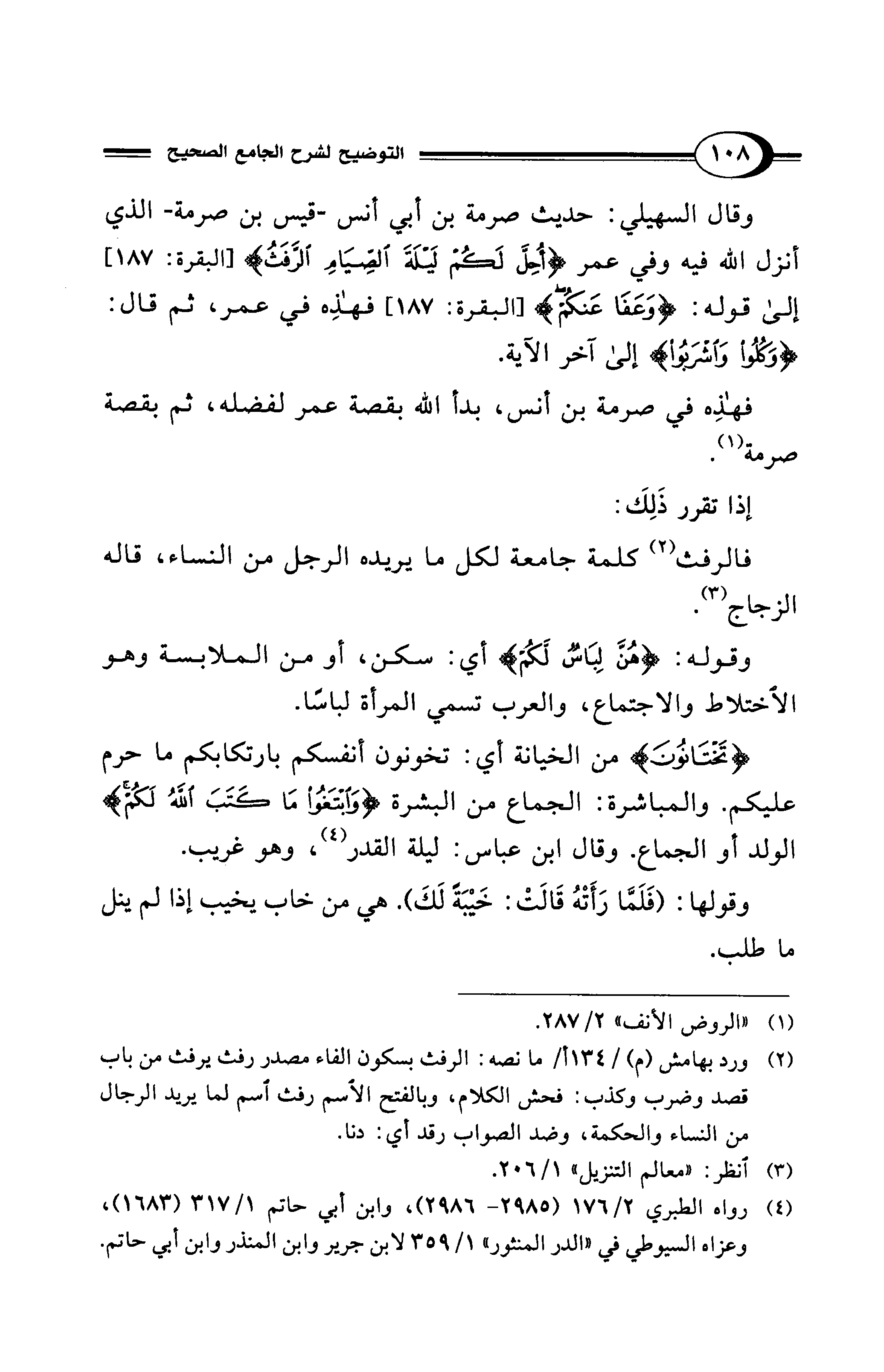 (¬2) ورد بهامش (م) / 134 أ/ ما نصه: الرفث بسكون الفاء مصدر رفث يرفث من باب قصد وضرب وكذب: فحش الكلام، وبالفتح الاسم رفث اسم لما يريد الرجال من النساء والحكمة، وضد الصواب رقد أي: دنا.