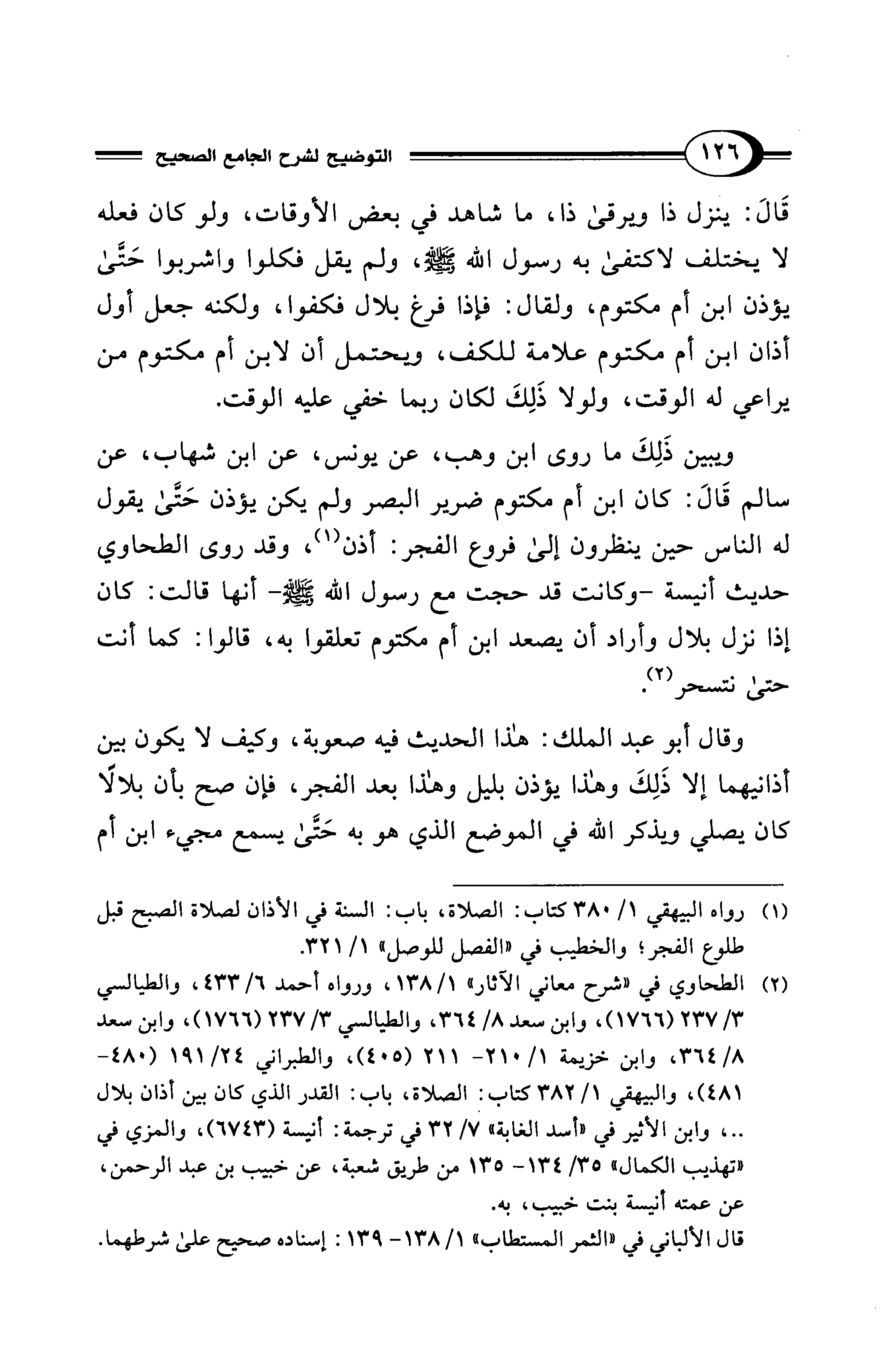 ويبين ذَلِكَ ما روى ابن وهب، عن يونس، عن ابن شهاب، عن سالم قَالَ: كان ابن أم مكتوم ضرير البصر ولم يكن يؤذن حَتَّى يقول له الناس حين ينظرون إلى فروع الفجر: أذن (¬1)، وقد روى الطحاوي حديث أنيسة -وكانت قد حجت مع رسول الله - صلى الله عليه وسلم -- أنها قالت: كان إذا نزل بلال وأراد أن يصعد ابن أم مكتوم تعلقوا به، قالوا: كما أنت حتى نتسحر (¬2).