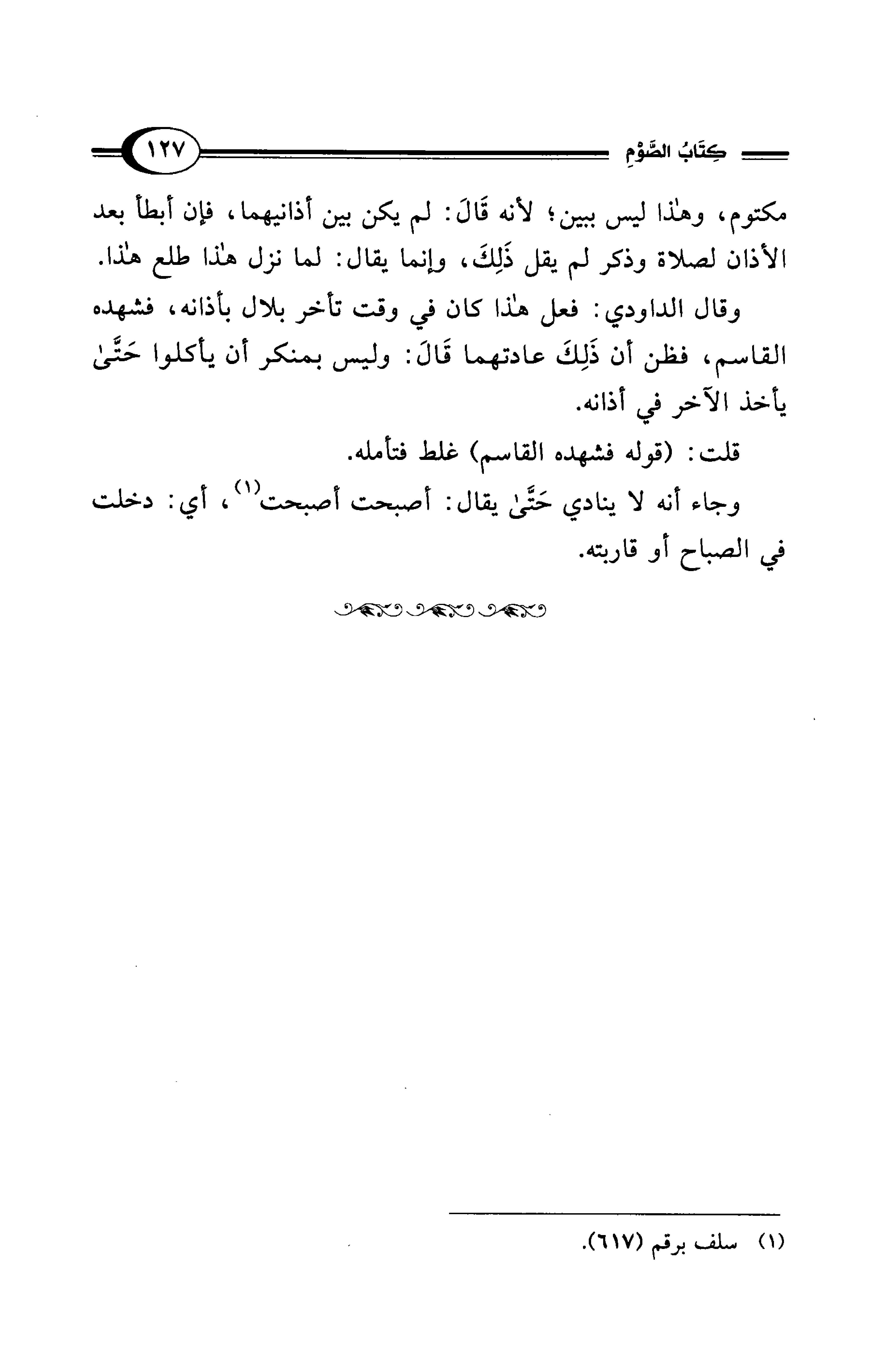 وقال الداودي: فعل هذا كان في وقت تأخر بلال بأذانه، فشهده القاسم، فظن أن ذَلِكَ عادتهما قَالَ: وليس بمنكر أن يأكلوا حَتَّى يأخذ الآخر في أذانه.