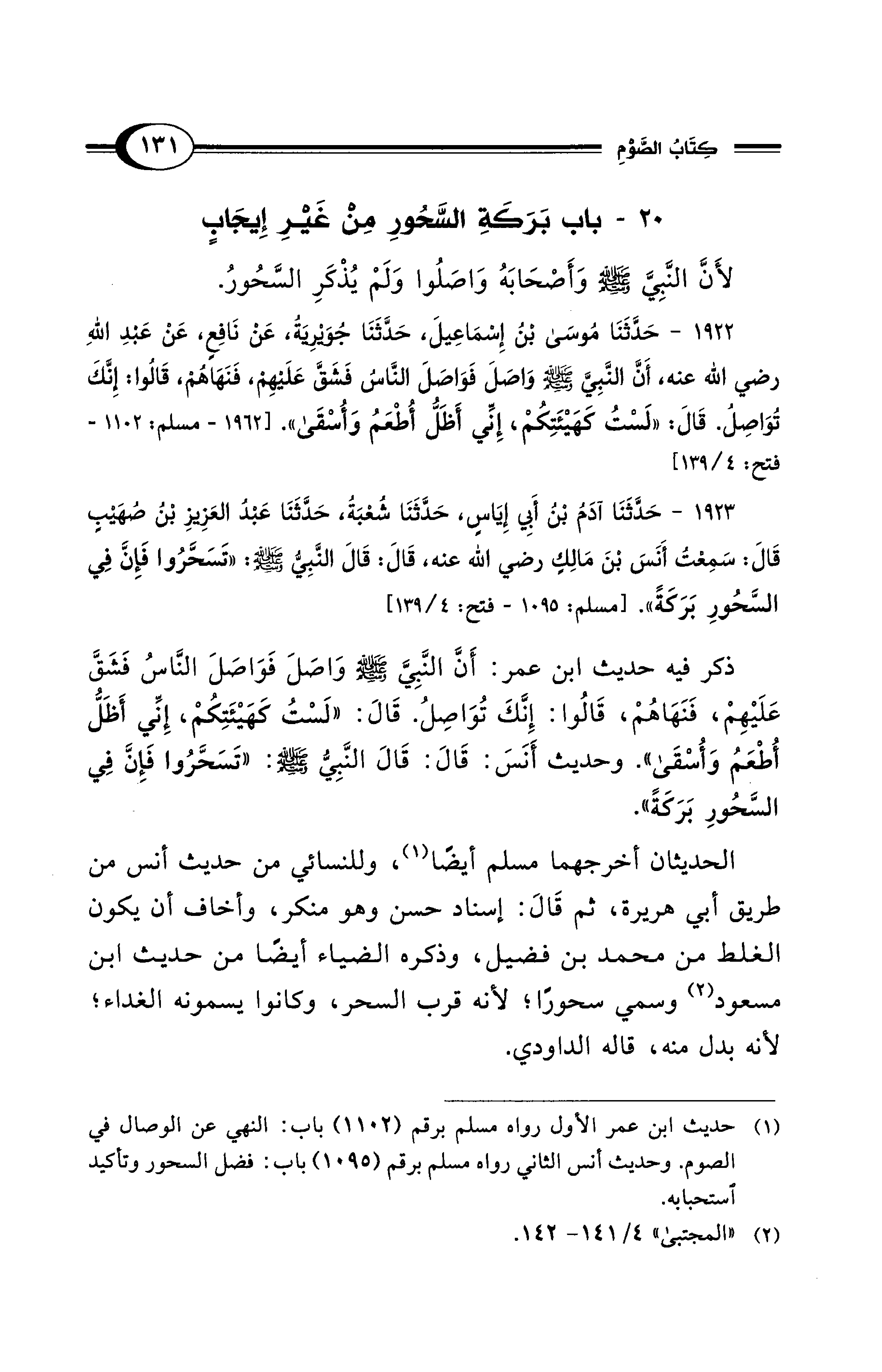 (¬1) حديث ابن عمر الأول رواه مسلم برقم (1102) باب: النهي عن الوصال في الصوم. وحديث أنس الثاني رواه مسلم برقم (1095) باب: فضل السحور وتأكيد استحبابه.