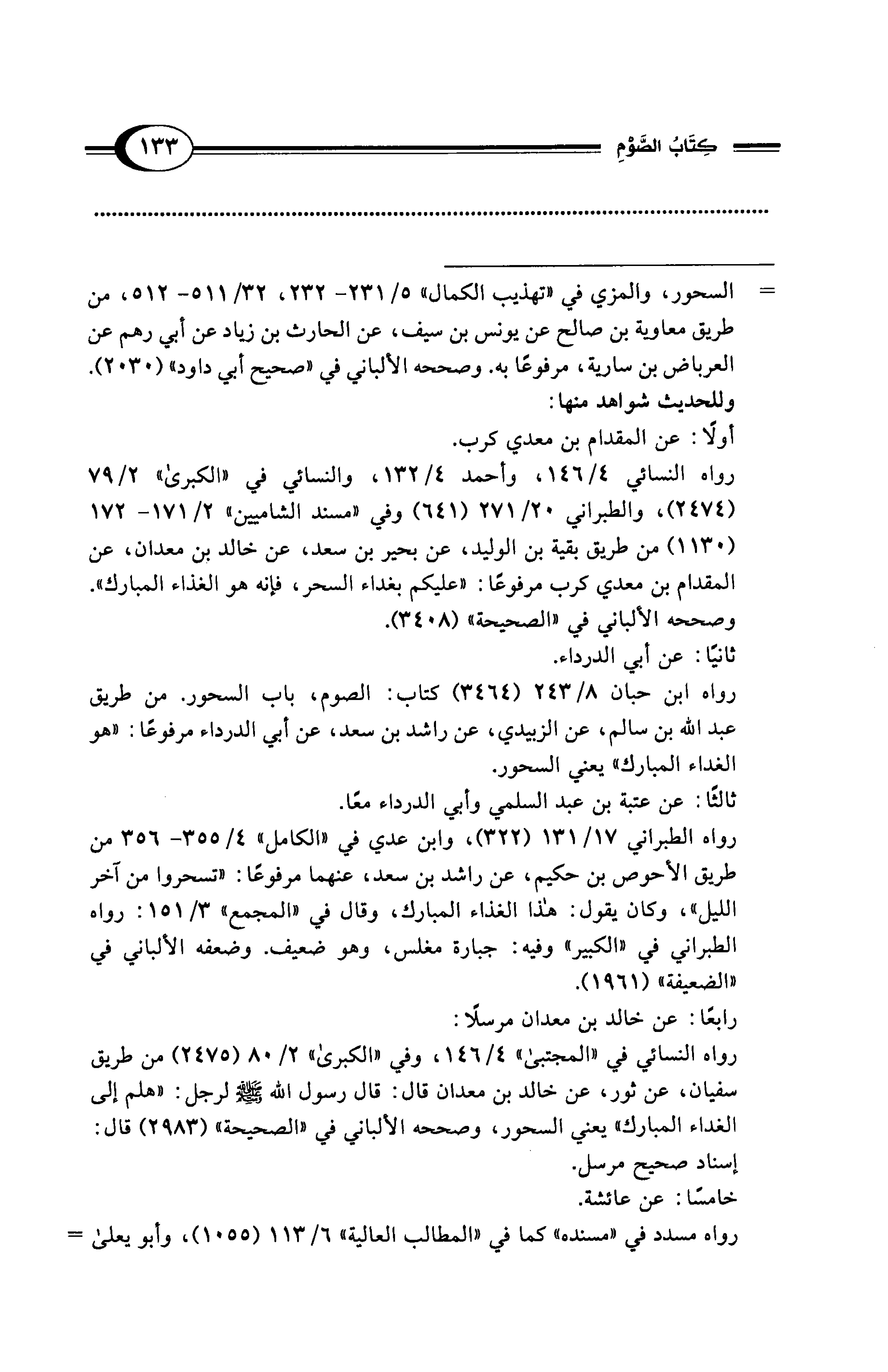 رواه النسائي 4/ 146، وأحمد 4/ 132، والنسائي في "الكبرى" 2/ 79 (2474)، والطبراني 20/ 271 (641) وفي "مسند الشاميين" 2/ 171 - 172 (1130) من طريق بقية بن الوليد، عن بحير بن سعد، عن خالد بن معدان، عن المقدام بن معدي كرب مرفوعًا: "عليكم بغداء السحر، فإنه هو الغذاء المبارك".