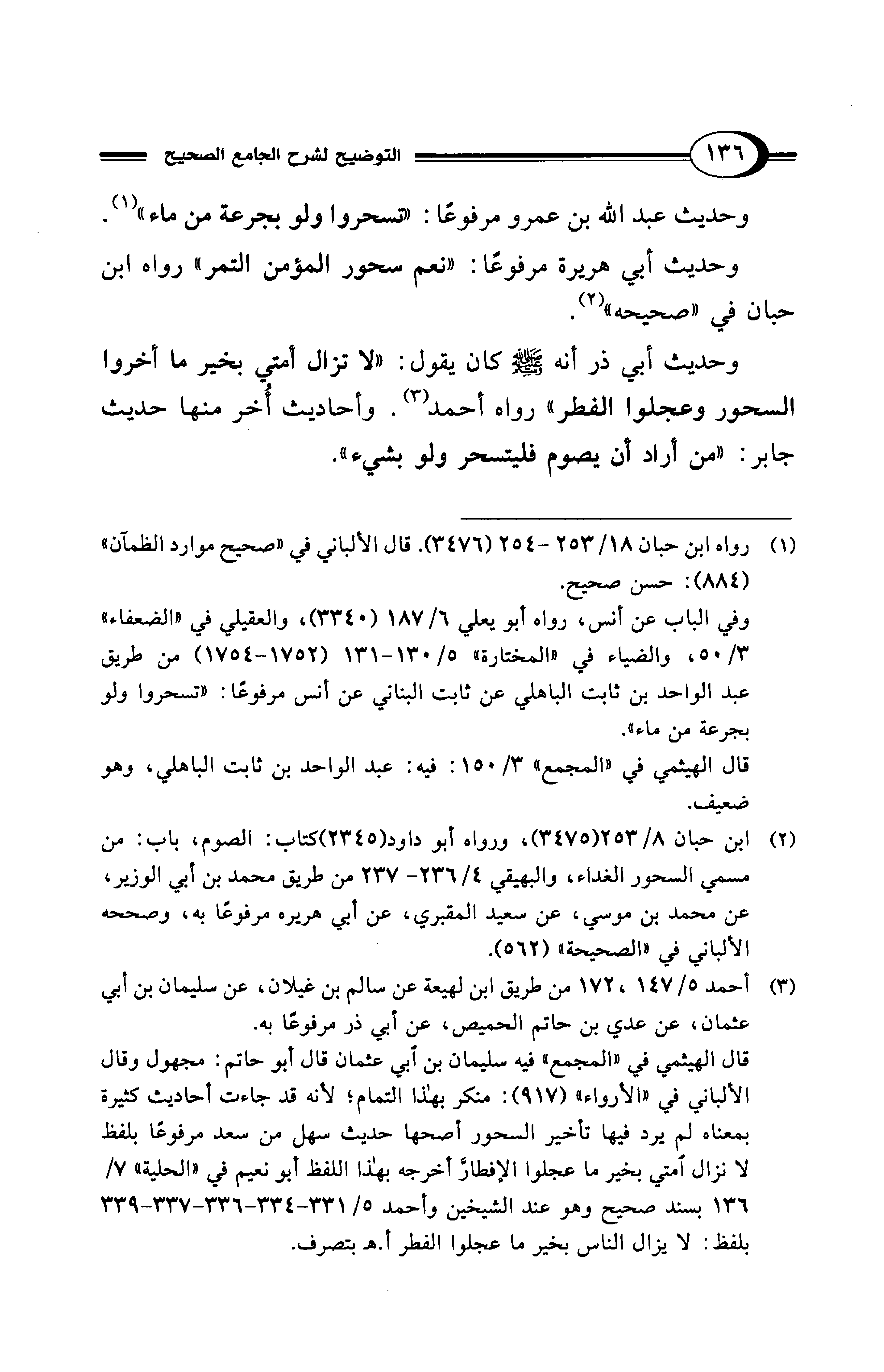 وحديث أبي ذر أنه - صلى الله عليه وسلم - كان يقول: "لا تزال أمتي بخير ما أخروا السحور وعجلوا الفطر" رواه أحمد (¬3). وأحاديث أُخر منها حديث جابر: "من أراد أن يصوم فليتسحر ولو بشيء".