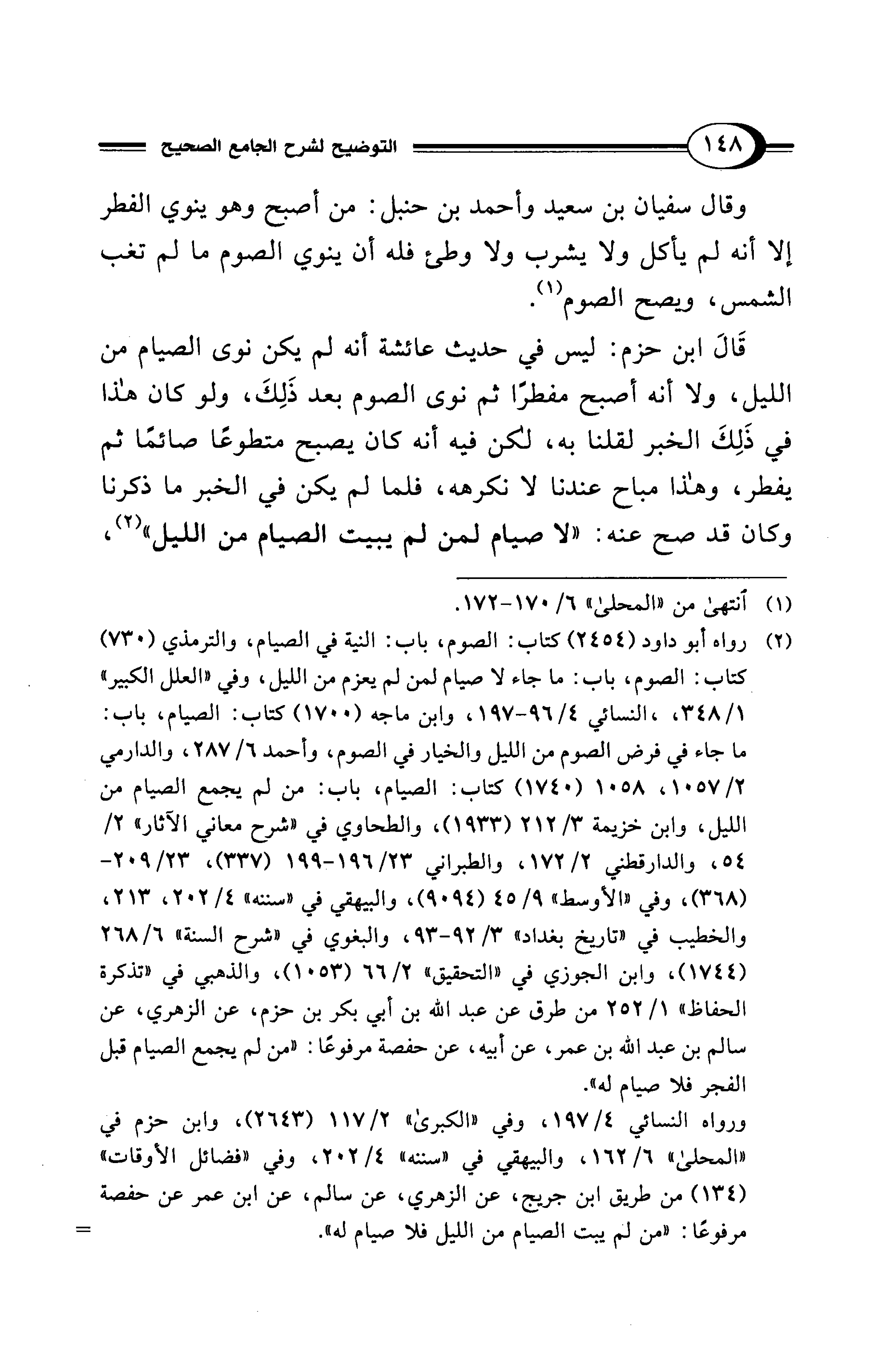 (¬2) رواه أبو داود (2454) كتاب: الصوم، باب: النية في الصيام، والترمذي (730) كتاب: الصوم، باب: ما جاء لا صيام لمن لم يعزم من الليل، وفي "العلل الكبير" 1/ 348،، النسائي 4/ 96 - 197، وابن ماجه (1700) كتاب: الصيام، باب: ما جاء في فرض الصوم من الليل والخيار في الصوم، وأحمد 6/ 287، والدارمي 2/ 1057، 1058 (1740) كتاب: الصيام، باب: من لم يجمع الصيام من الليل، وابن خزيمة 3/ 212 (1933)، والطحاوي في "شرح معاني الآثار" 2/ 54، والدارقطني 2/ 172، والطبراني 23/ 196 - 199 (337)، 23/ 209 - (368)، وفي "الأوسط" 9/ 45 (9094)، والبيهقي في "سننه" 4/ 202، 213، والخطيب في "تاريخ بغداد" 3/ 92 - 93، والبغوي في "شرح السنة" 6/ 268 (1744)، وابن الجوزي في "التحقيق" 2/ 66 (1053)، والذهبي في "تذكرة الحفاظ" 1/ 252 من طرق عن عبد الله بن أبي بكر بن حزم، عن الزهري، عن سالم بن عبد الله بن عمر، عن أبيه، عن حفصة مرفوعًا: "من لم يجمع الصيام قبل الفجر فلا صيام له".