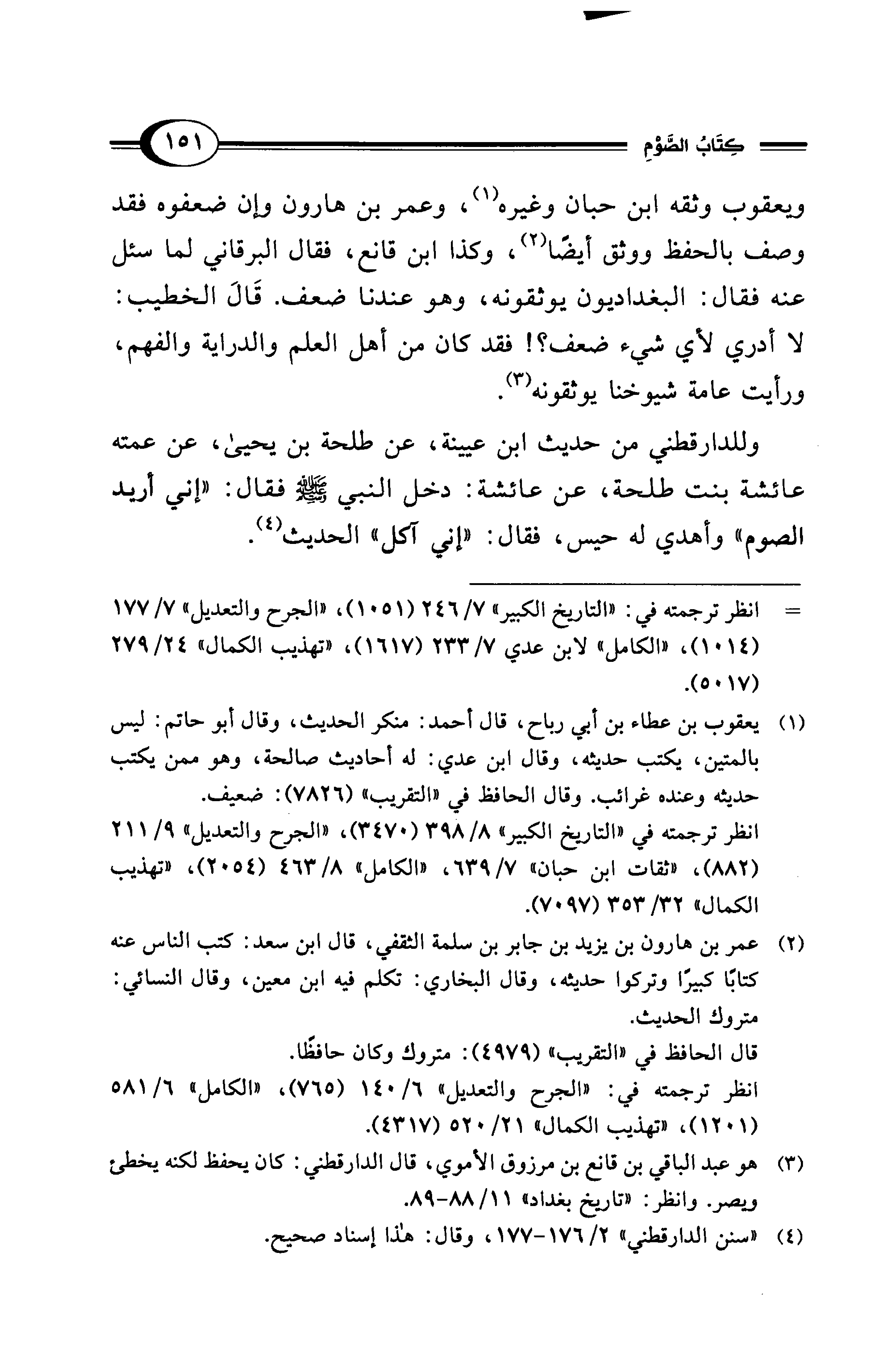 ويعقوب وثقه ابن حبان وغيره (¬1)، وعمر بن هارون وإن ضعفوه فقد وصف بالحفظ ووثق أيضًا (¬2)، وكذا ابن قانع، فقال البرقاني لما سئل عنه فقال: البغداديون يوثقونه، وهو عندنا ضعف. قَالَ الخطيب: لا أدري لأي شيء ضعف؟! فقد كان من أهل العلم والدراية والفهم، ورأيت عامة شيوخنا يوثقونه (¬3).