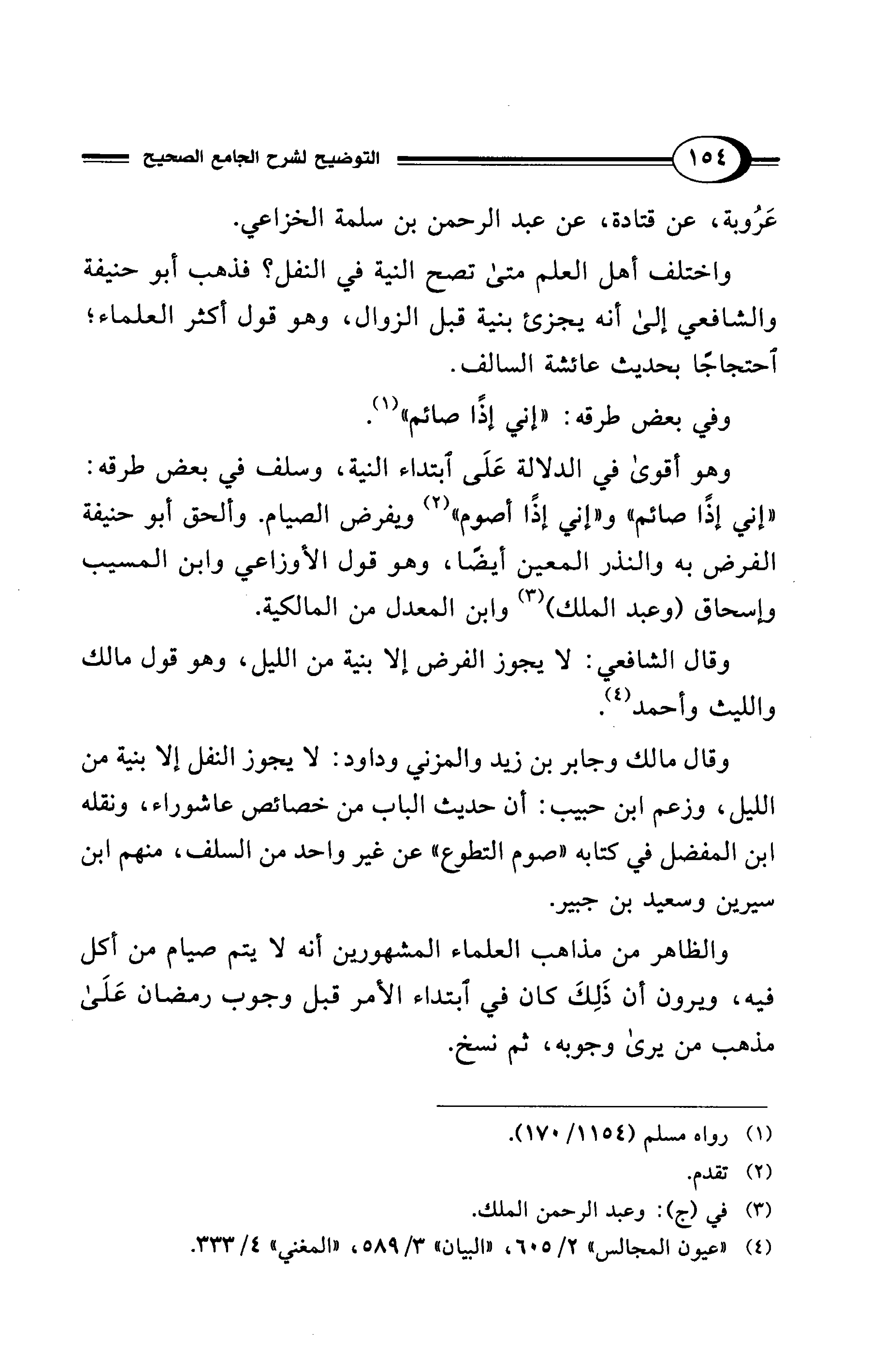 وقال مالك وجابر بن زيد والمزني وداود: لا يجوز النفل إلا بنية من الليل، وزعم ابن حبيب: أن حديث الباب من خصائص عاشوراء، ونقله ابن المفضل في كتابه "صوم التطوع" عن غير واحد من السلف، منهم ابن سيرين وسعيد بن جبير.